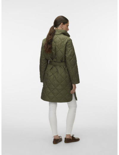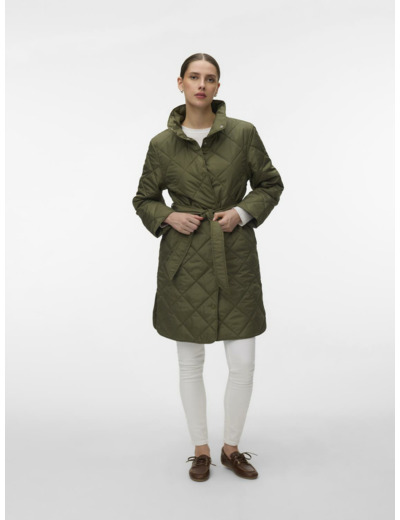 Product details include a high neck design, button closure, and a waist belt for shape definition. Ideal for outdoor use, this jacket balances function and fashion with ease.