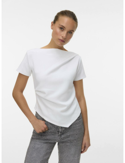 Crafted with a flattering boat neckline and cap sleeves, this T-shirt blends subtle gathered details with a sleek, regular fit. Pair it with boyfriend jeans and chunky sneakers to create a modern city outfit that balances comfort and edge. Its close-fitting sleeves add a refined touch, making it versatile for both casual days and laid-back evenings.