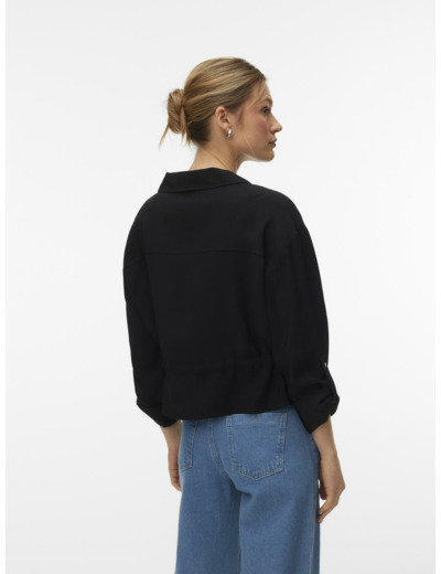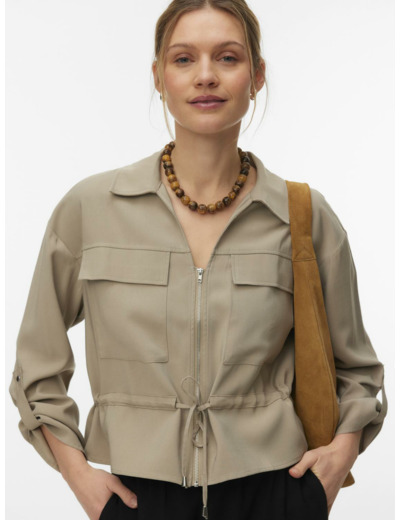 This blouse features a shirt collar, long sleeves, and a practical zipper closure. The drawstring waist detail enhances fit and style, making it a key piece for any season.