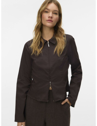 The shirt has a zip closure for easy wear and a modern look.