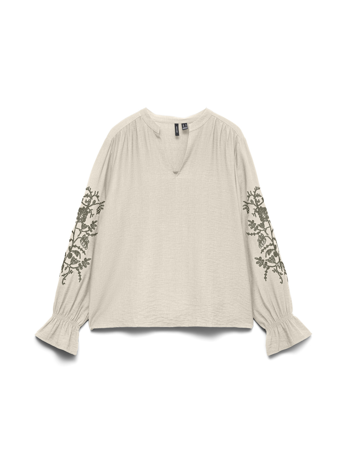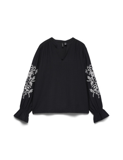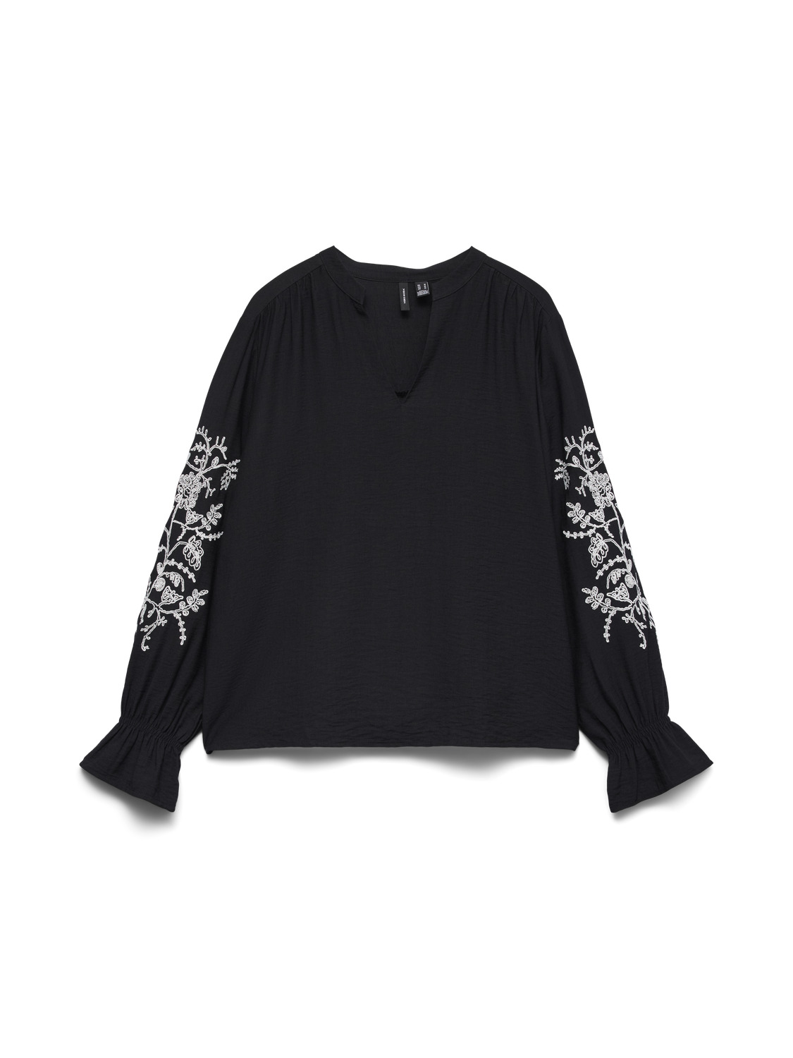 Crafted with attention to detail, this top features a classic V-neck, long voluminous sleeves finished with ruched cuffs, and delicate 3D embroidery for a unique texture. Its standard fit offers a balanced shape that flatters without clinging.