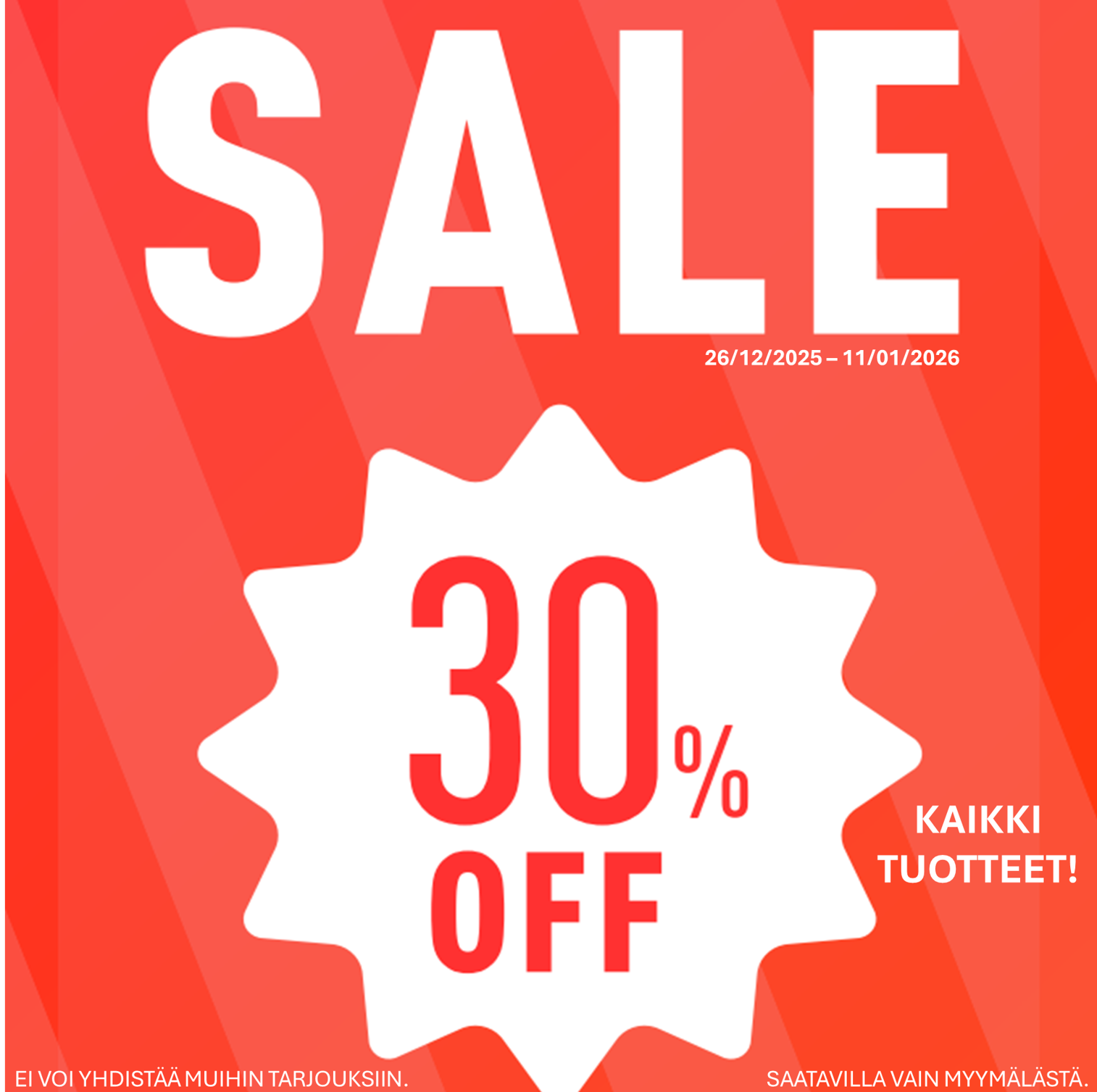 Nyt kaikki normaalihintaiset outlet-tuotteet –30 % lisäalennuksella! Tarjous voimassa vain myymälää eikä ole yhdistettävissä muihin etuihin.