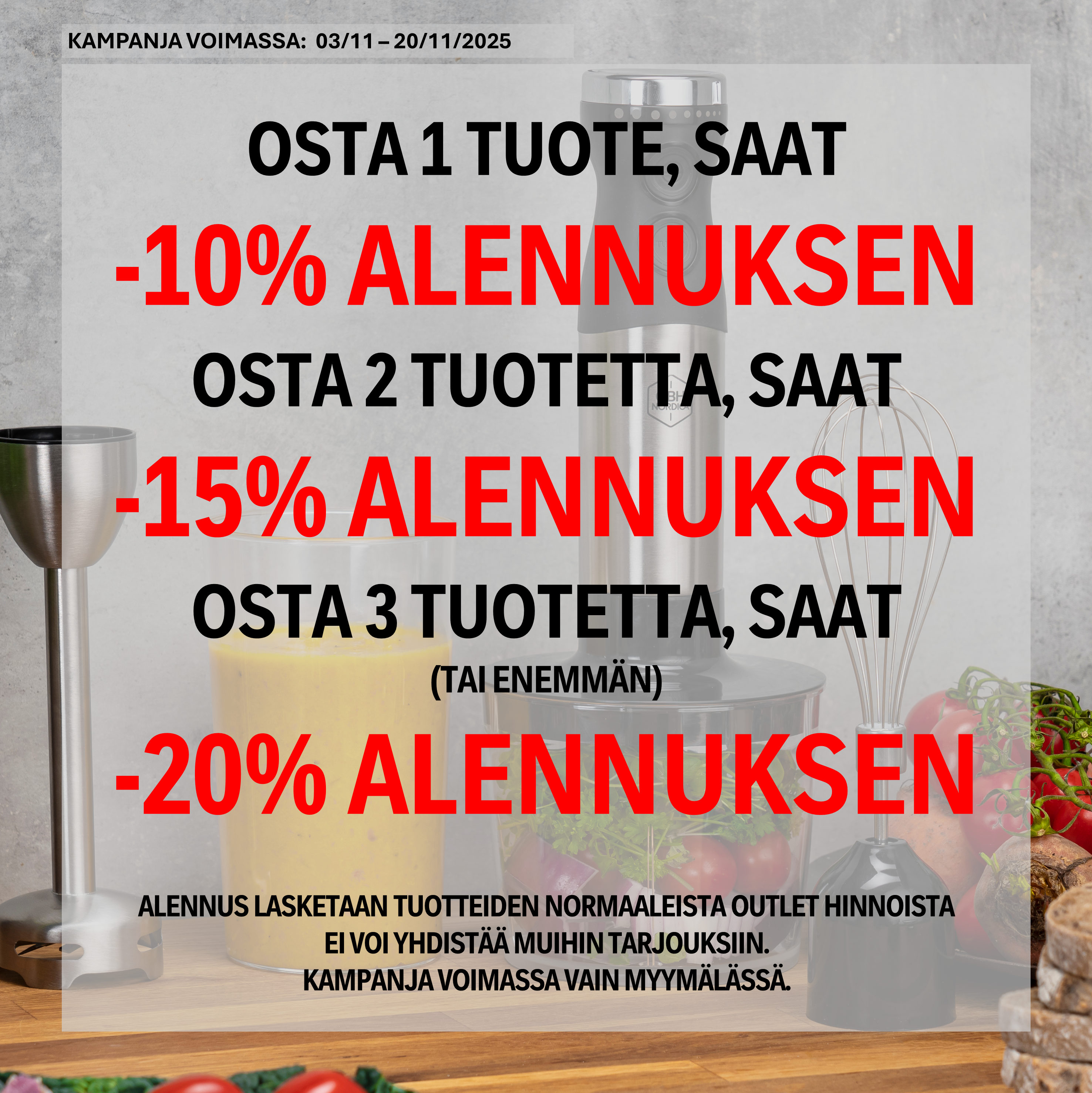 Osta enemmän, säästä enemmän – jo valmiiksi edullisista outlet-hinnoista! Kampanja voimassa vain myymälässä torstaihin 21.11. asti.