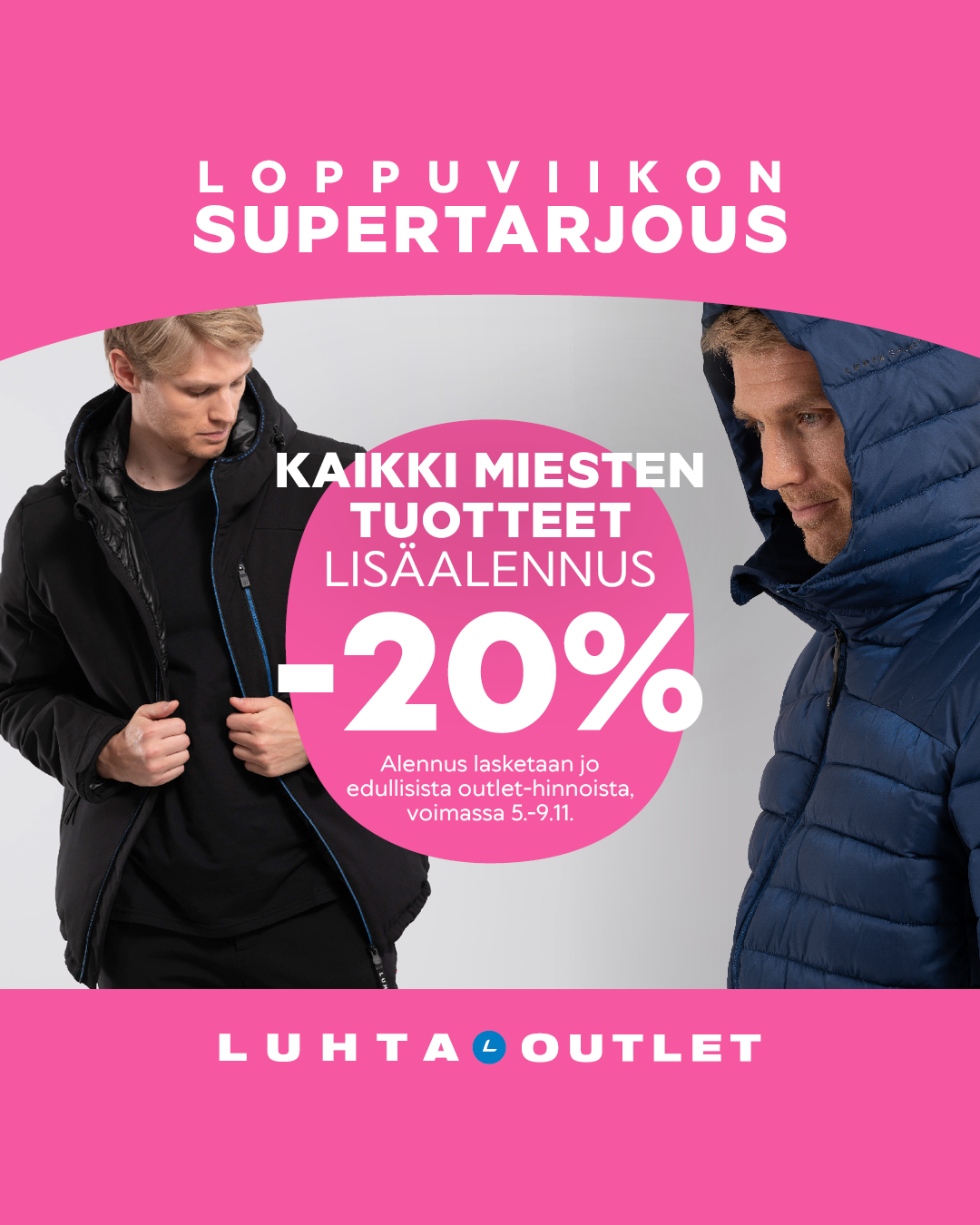 Kaikki Luhta Outletin miesten vaatteet ja kengät nyt -20 % lisäalennuksella outlet-hinnoista! Tarjous voimassa verkossa ja myymälässä sunnuntaihin 9.11. asti.