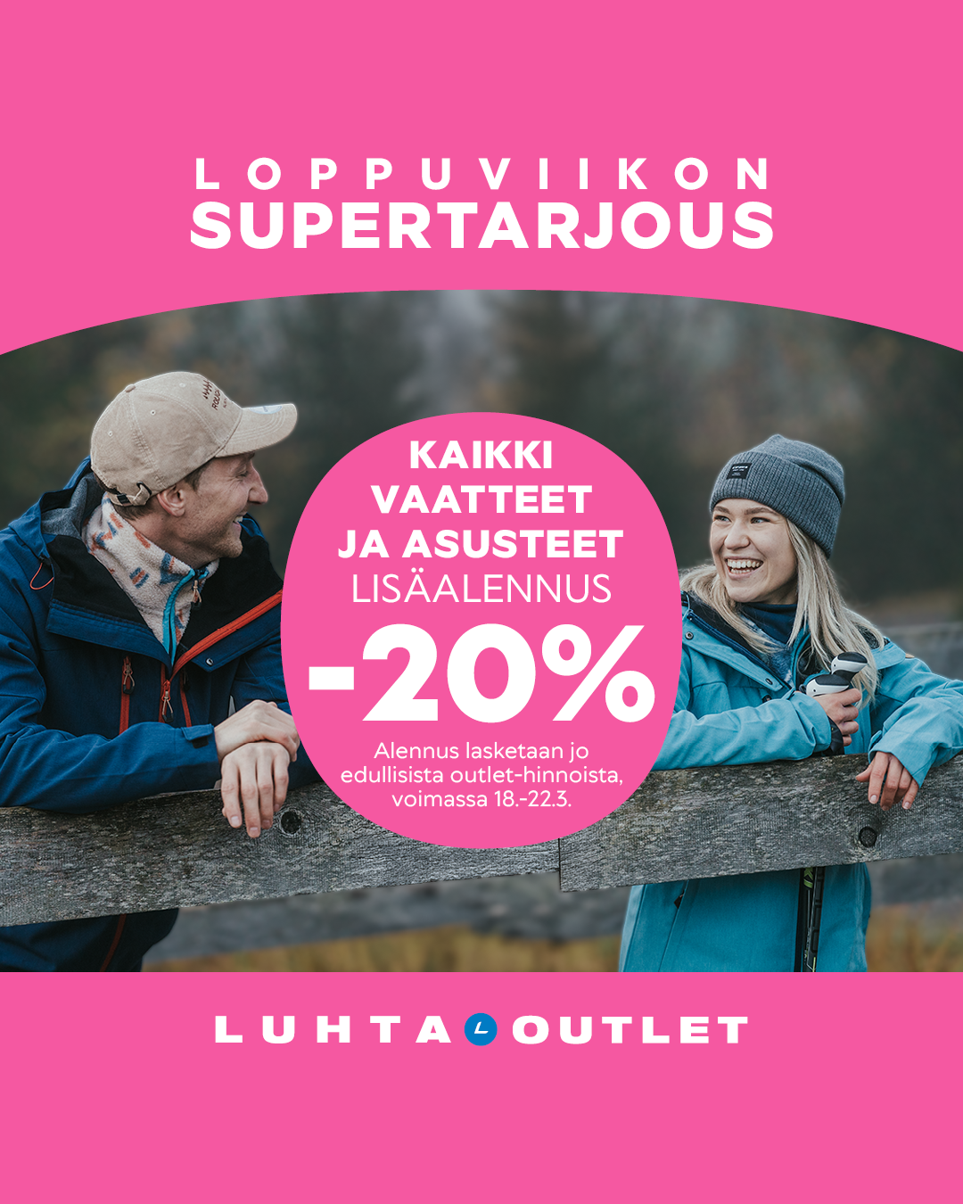 Saat lisäalennuksen kaikista Luhta Outletin vaatteista ja asusteista. Etu lasketaan jo edullisista outlet-hinnoista. Tarjous voimassa verkossa ja myymälässä sunnuntaihin 22.3. asti.