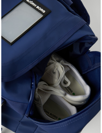 The Borg Duffle Bag 35L combines military-inspired design with modern functionality. Constructed from durable recycled polyester with a TPE coating, this navy sports bag resists moisture and stands up to demanding environments. Multiple carrying options allow you to wear it as a backpack, throw it over your shoulder, or carry it by the hand straps. YKK zippers with branded rubber pullers ensure reliable access throughout the bag, while a specialized wet pocket with water-resistant zippers provides separate storage for damp items. The design includes adjustable shoulder straps, a front zipper pocket, address tag, and a striking Borg logo on the side.