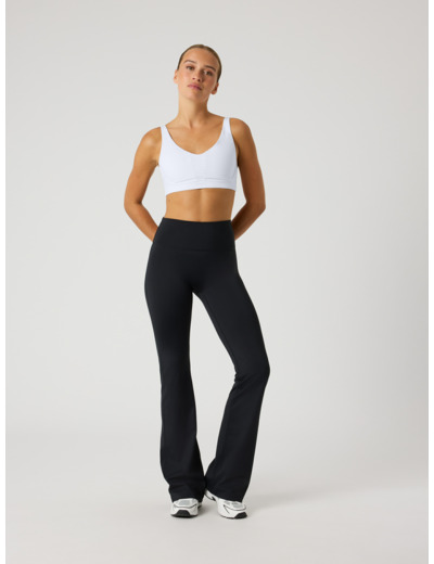 The Björn Borg Borg Flare Tights in black are stretch pants for women made from a blend of soft recycled polyester with a high-stretch quality fabric. They're full length with a slim fit, and feature a high and broad waistband on top with bootcut legs on the bottom, and a small tennis ball logo print on the back.