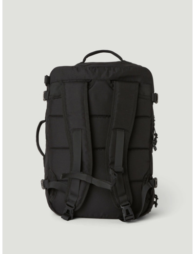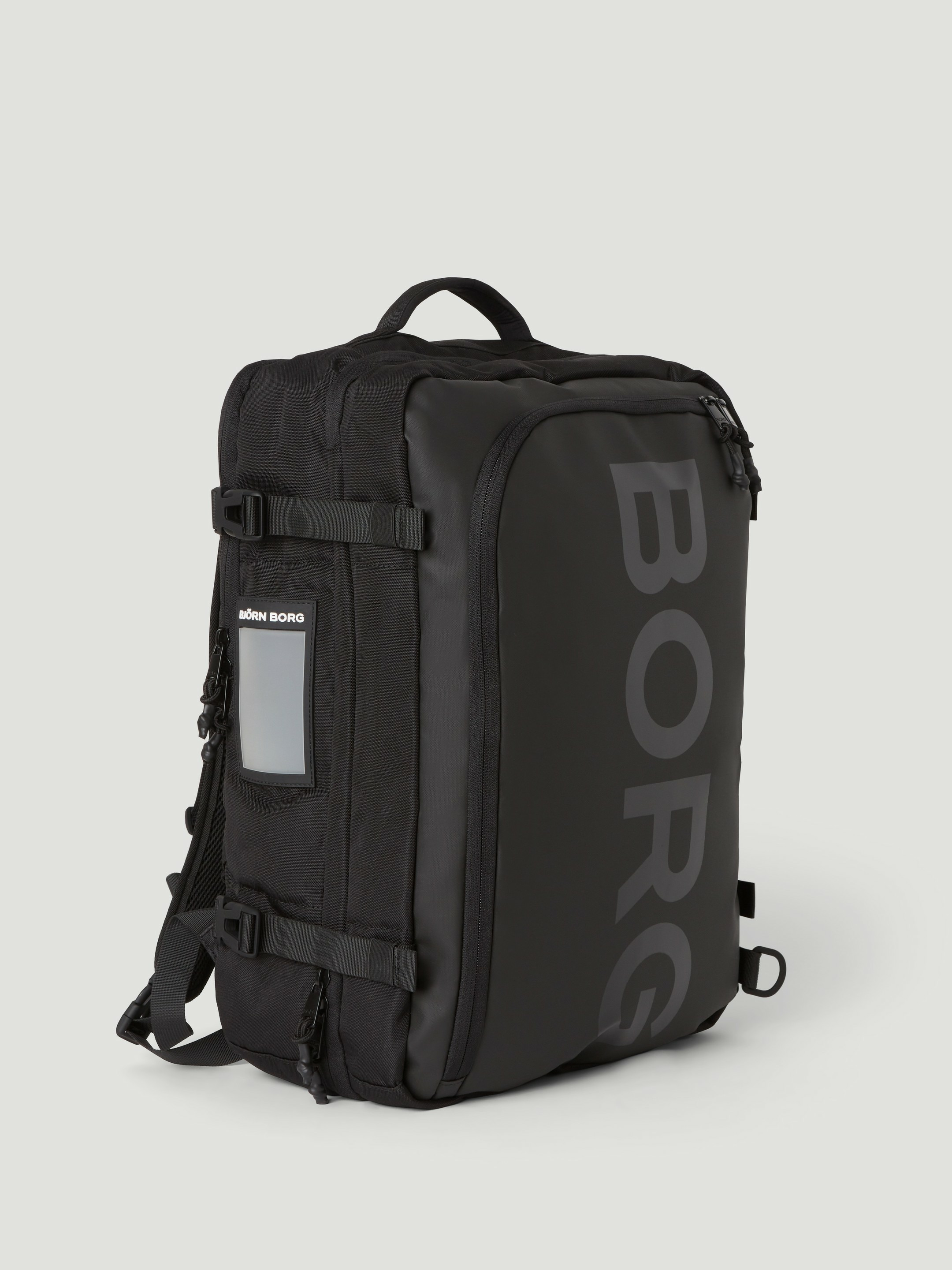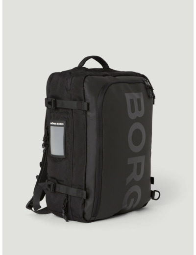 The Björn Borg Borg Travel Backpack L is a large travel bag made from polyester and TPE-coated polyester. It features padded adjustable backpack straps with a breast strap and a hand strap for easy carrying. It has two large zippered main compartments, a padded back panel for comfort, a zippered front pocket outside, and an address tag for convenience.