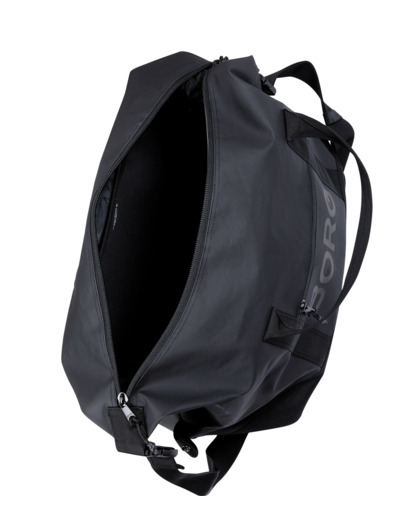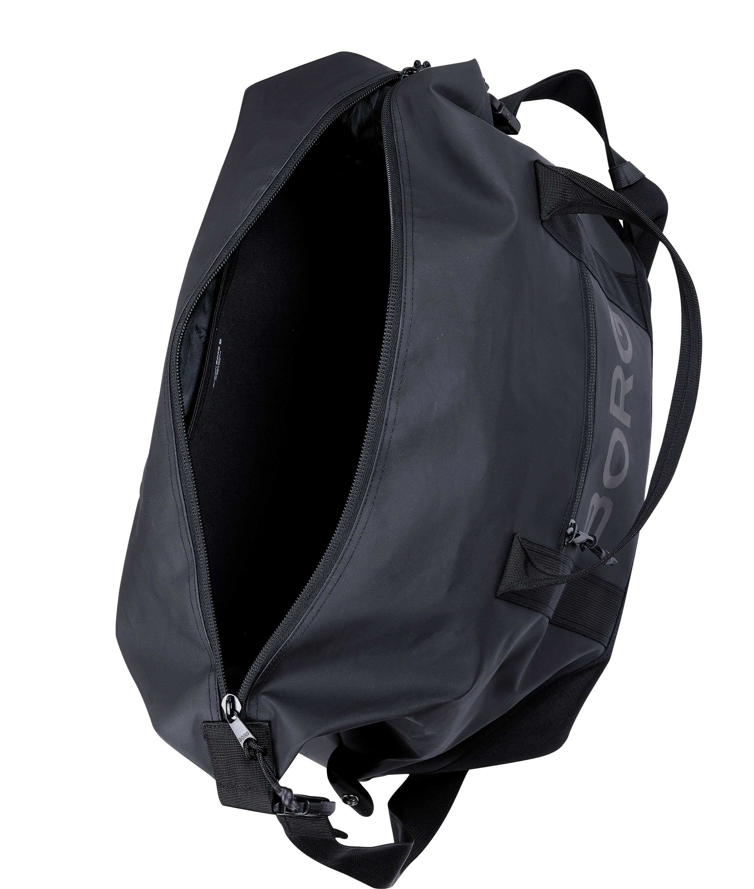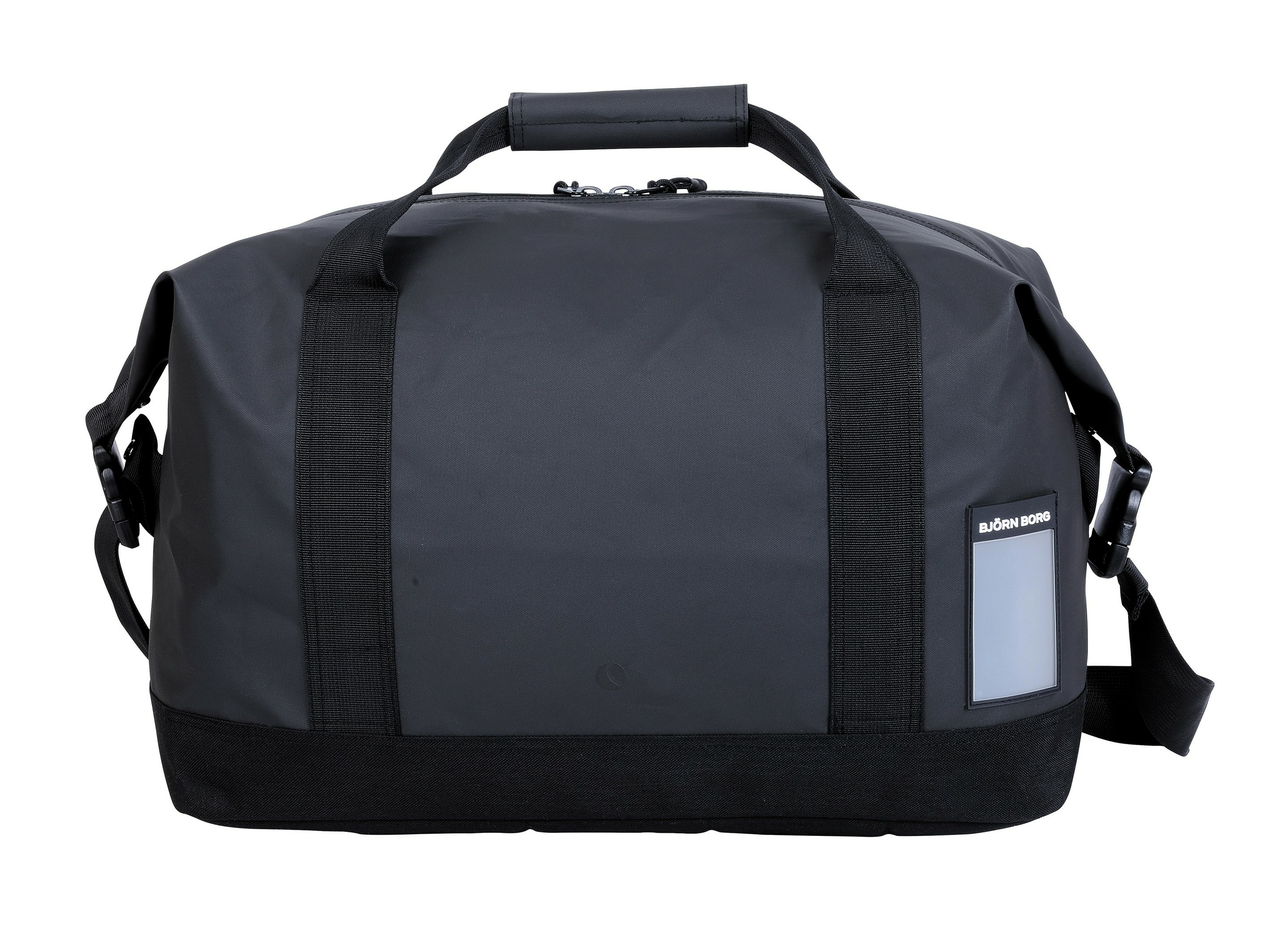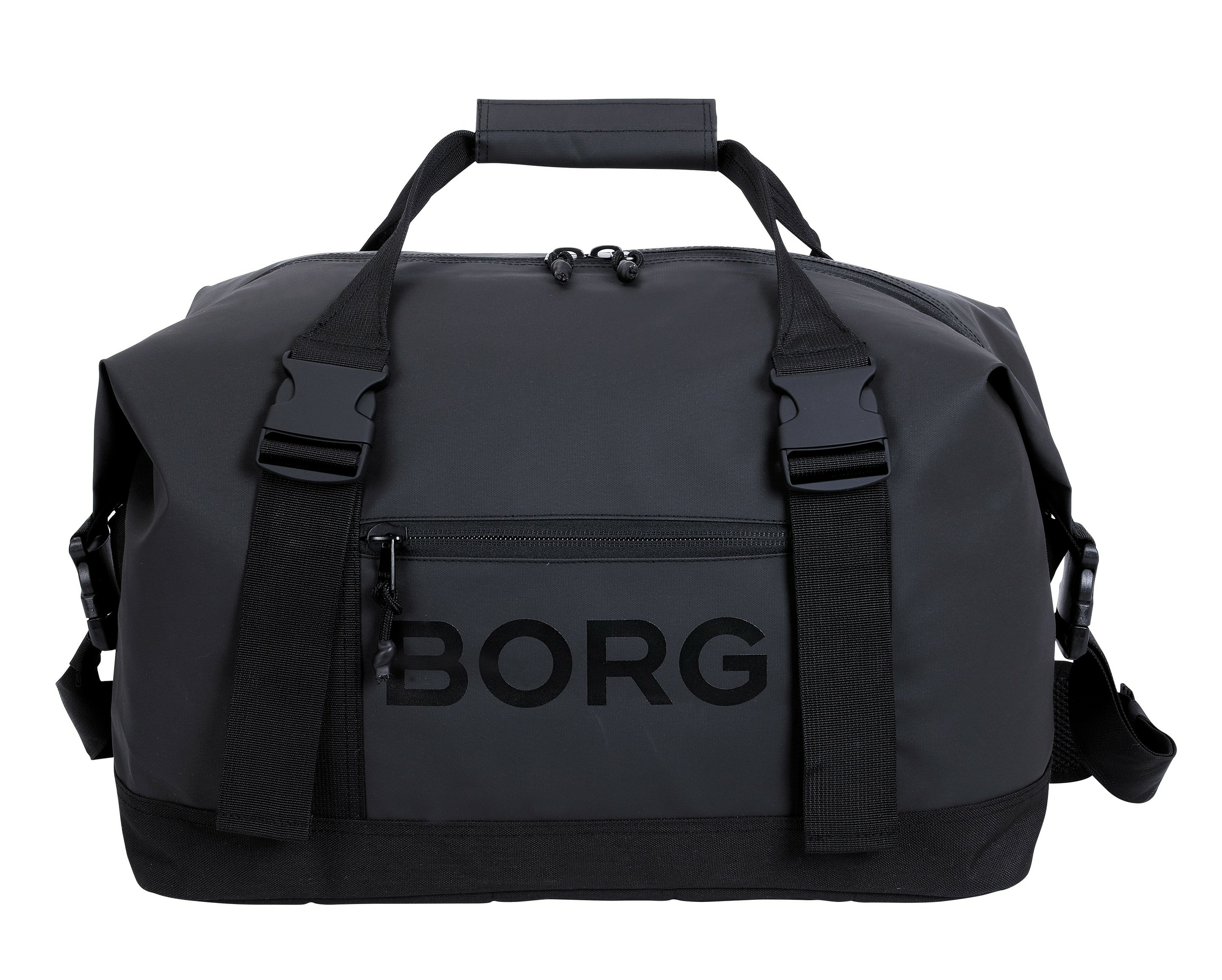 The Björn Borg Borg Travel Weekend Bag is made from durable TPE-coated polyester material. It has a detachable, adjustable shoulder strap and detachable large hand straps for easy carrying, and four adjustable buckles on the side to hold everything in place. With large dual zippers over the main compartment, a front zippered pocket and an inside zippered pocket, an address tag outside, and a large Borg logo on the side.