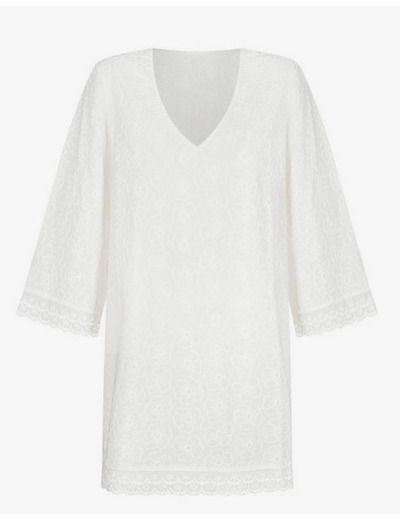 Gabriela tunika 100% puuvillaa. Kevyt, aavistuksen läpikuultava tunika, jossa on brodeerattuna kaunis kukkakuosi. Hihansuissa ja helmassa kaunis brodyyripitsi. Koot S -XL. Värit valkoinen ja keltainen