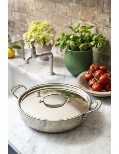 Kannellinen Tefal Jamie Oliver Cook's Classics SS -paistokattila on valmistettu kestävästä, kiillotetusta ruostumattomasta teräksestä ja sen avulla valmistat ruokaa ammattilaisen tavoin. Se on käytössä äärimmäisen kestävä ja sopii tyylikkyytensä ansiosta erinomaisesti myös ruoan tarjoiluun. Ihanteellinen haudutettavien ruokien kypsentämiseen: Jamie Oliver Cook's Classics SS -paistokattilan verrattomien paisto- ja haudutusominaisuuksien ansiosta kypsennettäviin raaka-aineisiin voidaan ensin paistaa kaunis ruskea pinta, minkä jälkeen ruoka on mahdollista hauduttaa mureaksi samassa astiassa esimerkiksi uunissa. Paistokattila on kannellinen ja korkealaitainen, mikä mahdollistaa monipuolisen käytön sekä suurten annosten valmistamisen - voit helposti laittaa ruokaa koko perheelle tai vieraille. Lisäksi ruoanlaitto sujuu siistimmin ja kätevämmin, kun ruokaa ei roisku liedelle. Tarttumaton ja turvallinen Tefal Titanium -pinnoite: Paistokattilan sisäpinnalla on tarttumaton ja erittäin kestävä Tefal Titanium -pinnoite, mikä on vahvistettu mineraalitäytteellä ja päällikerros on vahvistettu titaanihiukkasilla. Titanium-pinnoite kestää kolme kertaa pidempään kuin Tefalin standardipinnoitteet. Sen ansiosta pinnoite kestää kovaa päivittäistä käyttöä ja on helppo puhdistaa. Pinnoite on täysin turvallinen. Uusi selkeä Thermo-Signal-lämpötunnistin: Tefalin uusi selkeä Thermo-Signal-lämpötunnistin vaihtaa väriä, kun paistokattila on saavuttanut ihanteellisen paistolämpötilan noin 180 °C ja on käyttövalmis. Tämä takaa ruoan täydellisen paistopinnan, koostumuksen, värin ja maun. Thermo-Fusion-induktiopohja: Paksun Thermo-Fusion-induktiopohjan laajempi induktioalue takaa entistä nopeamman lämpenemisen ja tasaisemman lämmönjakautumisen. Halkaisija: 30 cm. Kaikki keittotasot: yhteensopiva kaikkien liesityyppien kanssa, mukaan lukien induktio. Laadukkaat niitatut kädensijat ovat kestävää ruostumatonta terästä. Uuninkestävyys: 250 °C. Kestää konepesun, mutta käsinpesu pidentää käyttöikää. Tyylikästä ruostumatonta terästä Tarttumaton ja erittäin kestävä Tefal Titanium -pinnoite.
