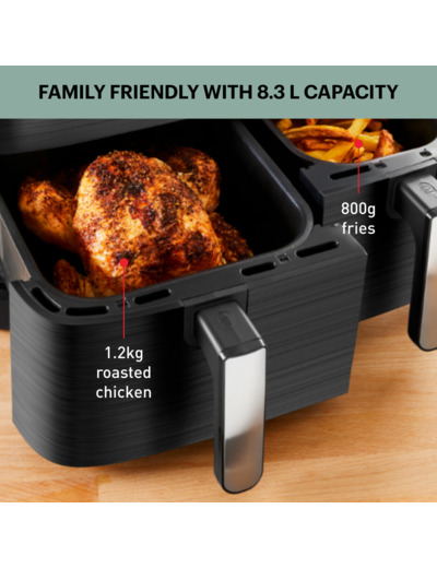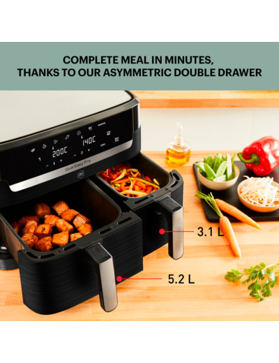 Dual Easy Fry on tilava ilmafriteerauskeitin. Kahden erilaisen kypsennysastian avulla voidaan helposti valmistaa kokonainen ateria kotona koko perheelle samalla kertaa. Dual Easy Fry -keittimessä on kaksi kypsennysastiaa, joista toisen tilavuus on 5,2 litraa ja toisen 3,1 litraa. Ne ovat toisistaan riippumattomia, mikä tarkoittaa, että erilaisia ruokalajeja voidaan valmistaa erillisissä kypsennysastioissa samanaikaisesti. Voit myös synkronoida kaksi eri ohjelmaa niin, että eri lokeroissa valmistettavat ruoat valmistuvat samanaikaisesti.