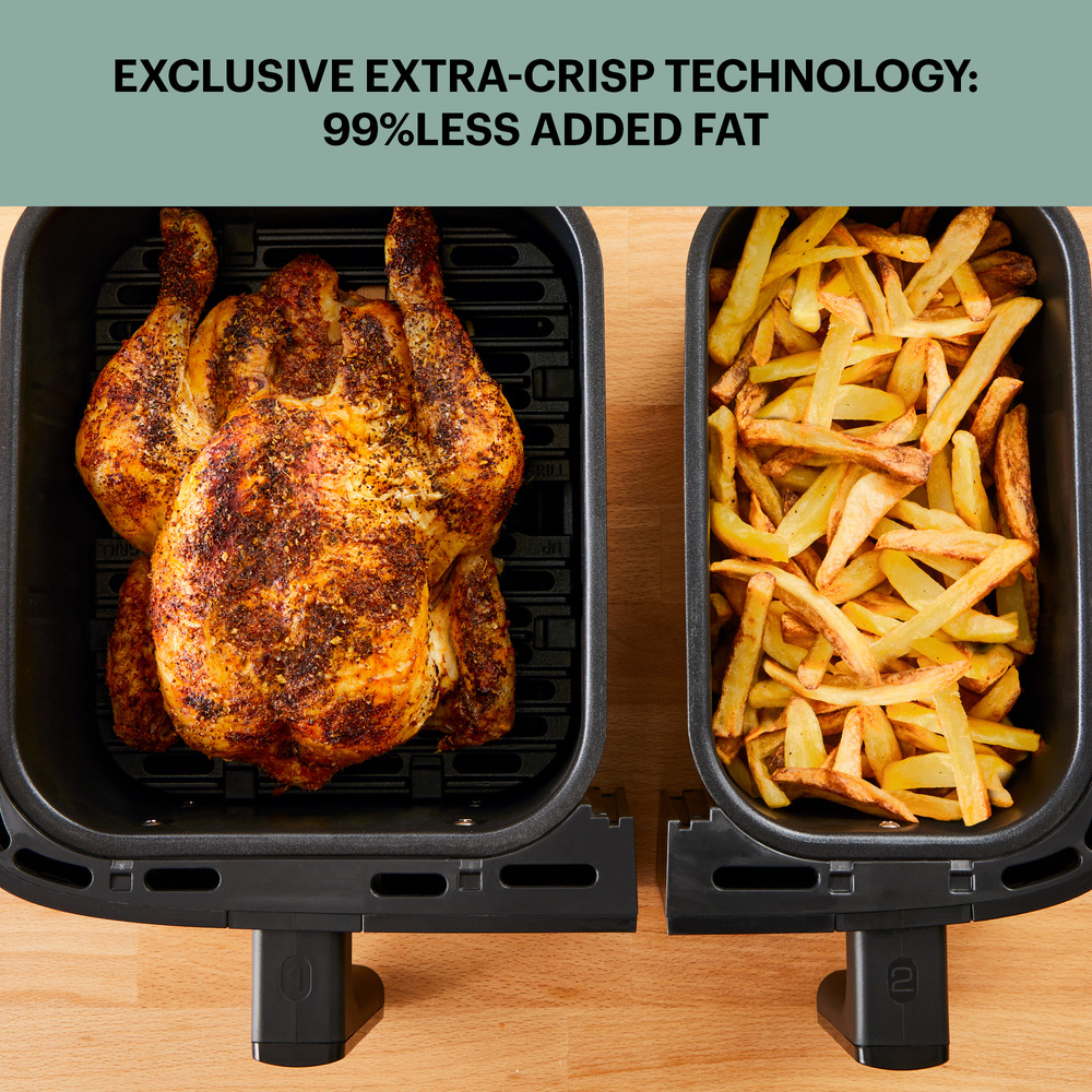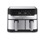 Valmista helposti erilaisia ruokalajeja samanaikaisesti koko perheelle Dual Easy Fry & Grill -air fryerin avulla voit helposti valmistaa erilaisia ruokalajeja samanaikaisesti koko perheelle. Laitteessa on kaksi kypsennysastiaa, joista toisen tilavuus on 5,2 litraa ja toisen 3,1 litraa. Voit käyttää yhtä aikaa molempia kypsennysastioita ja siten valmistaa esimerkiksi täydellisesti friteerattuja perunoita ja grillattua lihaa. 5,2 litran kypsennysastiassa on mukana grillausparila, joten voit kypsentää sillä kaikki grilliherkut, esim. murean ja mehukkaan pihvin, mehevän kalan ja kanan sekä kasvikset. 5,2 litran astia soveltuu myös kaikkien muiden toimintojen käyttmiseen. Pienempi astia soveltuu kaikkien muiden, paitsi grillaustoiminnon käyttämiseen. Vaihtelua ruoanlaittoon Air Fryer -tekniikan ja grillitoiminnon lisäksi laitteessa on kahdeksan automaattiohjelmaa esimerkisi kanalle, vihanneksille, kalalle, lihalle ja ranskanperunoille. Extra Crisp -tekniikan ansiosta ranskalaisista perunoista tulee kullankeltaisia, erittäin rapeita ja maukkaita. Dual Easy Fry & Grill -air fryerin avulla voit myös paistaa, paahtaa, halstrata ja lämmittää jo kypsennettyä ruokaa. Laitteen lämpötila on helppo säätää välillä 40200 °C. Laitteessa on myös kuivausohjelma, jossa on 10 tunnin ajastin. Tarvitsetko inspiraatiota siihen, mitä ilmafriteerauskeittimessä voi valmistaa? Tutustu OBH Nordican reseptipankkiin. Säästä aikaa ja energiaa OBH Nordican air fryer on yksinkertainen tapa pienentää kodin sähkönkulutusta. Käytettäessä Dual Easy Fry & Grill -air fryeriä energiaa kuluu jopa 65 % vähemmän ja kypsennysaika on jopa 40 % lyhyempi verrattuna perinteisiin uuneihin. Luvut perustuvat vuonna 2023 tehtyyn testiin pakasteranskalaisilla. Dual Easy Fry & Grill on korjattavissa 15 vuotta, mikä tarkoittaa, että voimme lähettää varaosia 6 200 korjaamolta ympäri maailmaa kohtuulliseen hintaan. Näin haluamme varmistaa, että tuotteen käyttöä voidaan jatkaa vuosikausien ajan. Helppo puhdistaa Öljy ja friteeratut elintarvikkeet ovat yleensä hankalasti puhdistettavissa. Kaikki tämän laitteen puhdistusta vaativat osat ovat irrotettavissa, ja ne kestävät konepesun. Lisävarusteet Dual Easy Fry & Grill -keittimen mukana toimitetaan tarttumattomaksi pinnoitettu ja erittäin vankkatekoinen grillausparila, joka sopii suureen kypsennysastiaan. Mukana on myös pienempään kypsennysastiaan sopiva tavallinen ritilä, opas ilmafriteerauskeittimen käytön aloittamiseen ja käyttöopas.