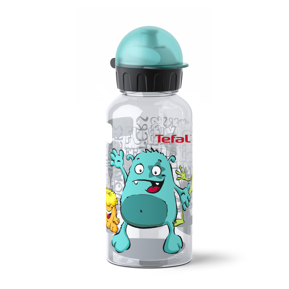 Drink2Go lasten juomapullo on valmistettu Tritan®- muovista. Pullo on kirkas kuin lasi, mutta särkymätön. Pullossa on ergnominen silikoninen juomanokka, joka aukeaa napista painamalla ja sulkeutuu automaattisesti, kun juompullon kansi suljetaan. Laaja täyttöaukko. 100% tiivis, ei läikytä juomaa kassin pohjalle. Vihreäsävyinen Monster-kuvio. Konepesun kestävä. Koko 0,4 L.