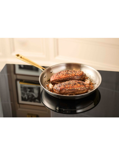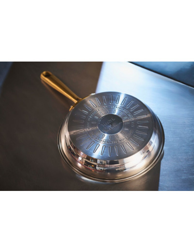 Tämä pinnoittamaton premium-laatuisesta 18/10 ruostumattomasta teräksestä valmistettu paistinpannu on tehty 90 % kierrätetystä materiaalista, ja sen peilikiillotettu ulkopinta tuo keittiöösi hienostuneen ilmeen. Pinnoittamaton, mattapintainen pohja antaa sinulle täydellisen hallinnan ruoanlaitossa. Paistinpannussa on ergonominen, niitattu ruostumattomasta teräksestä valmistettu kahva, jossa on kullanvärinen messinkiefekti ja kaiverrettu Paul Bocuse -allekirjoitus, joka lisää ylellisyyttä keittiöösi. Paistinpannun halkaisija on 28 cm.