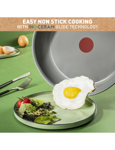 Vähemmän ympäristövaikutuksia, enemmän hyvää ruokaa! Tefalin (RE)NEWALissa on keraamisesti pinnoitettujen keitto- ja paistoastioiden innovaatio ruoan valmistamiseksi aivan uudella tavalla. Valmistettu Ranskassa materiaaleista, joilla on tavallista pienemmät ympäristövaikutukset. Tuotteen alumiinirunko on valmistettu 100-prosenttisesti kierrätetystä materiaalista*, mikä tarkoittaa pienempää ympäristöjalanjälkeä. Turvallinen ja kestävä keraaminen tarttumaton pinnoite estää ruokaa tarttumasta pannuun tai keittoastiaan kypsennyksen aikana, vaikka rasvaa tai öljyä käytettäisiin vain vähän tai ei ollenkaan. Täydellinen tuoreiden ja terveellisten aterioiden valmistukseen. (RE)NEWAL on myös yhteensopiva kaikkien keittotasojen kanssa, mukaan lukien induktio. Siinä on älykäs Thermo-Signal-lämpötilailmaisin, joka vaihtaa väriä, kun lämpötila on täydellinen kypsennyksen aloittamiseen. (RE)NEWALissa ei ole tingitty tarttumattomuudesta eikä helppokäyttöisyydestä, joten sekä astian puhdistaminen että herkullisen ruoan valmistaminen on helppoa.