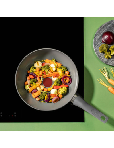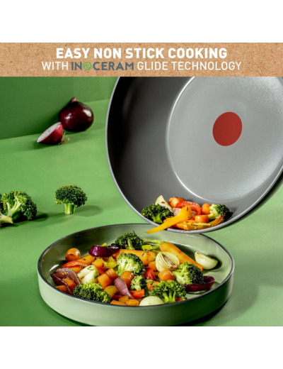 Vähemmän ympäristövaikutuksia, enemmän hyvää ruokaa! Tefalin (RE)NEWALissa on keraamisesti pinnoitettujen keitto- ja paistoastioiden innovaatio ruoan valmistamiseksi aivan uudella tavalla. Valmistettu Ranskassa materiaaleista, joilla on tavallista pienemmät ympäristövaikutukset. Tuotteen alumiinirunko on valmistettu 100-prosenttisesti kierrätetystä materiaalista*, mikä tarkoittaa pienempää ympäristöjalanjälkeä. Turvallinen ja kestävä keraaminen tarttumaton pinnoite estää ruokaa tarttumasta pannuun tai keittoastiaan kypsennyksen aikana, vaikka rasvaa tai öljyä käytettäisiin vain vähän tai ei ollenkaan. Täydellinen tuoreiden ja terveellisten aterioiden valmistukseen. (RE)NEWAL on myös yhteensopiva kaikkien keittotasojen kanssa, mukaan lukien induktio. Siinä on älykäs Thermo-Signal-lämpötilailmaisin, joka vaihtaa väriä, kun lämpötila on täydellinen kypsennyksen aloittamiseen. (RE)NEWALissa ei ole tingitty tarttumattomuudesta eikä helppokäyttöisyydestä, joten sekä astian puhdistaminen että herkullisen ruoan valmistaminen on helppoa.