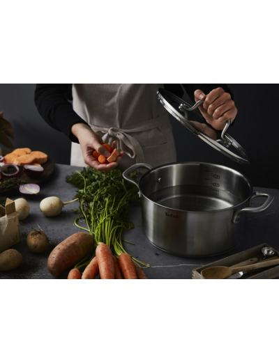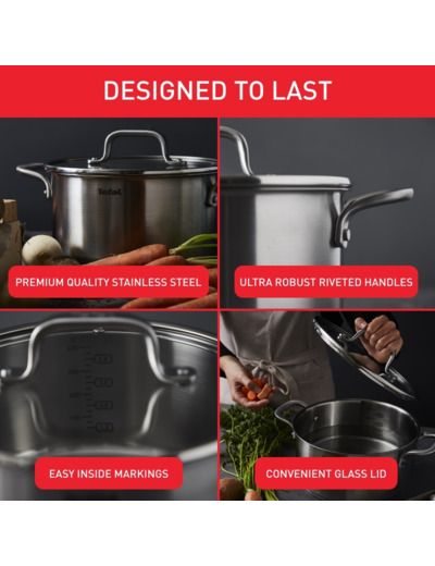 Sarjan kattiloissa ja pannuissa on niitatut kahvat, jotka takaavat tukevan ja turvallisen otteen. Tefalin älykäs Thermo-Signal-lämpötilanilmaisin vaihtaa väriä, kun pannu saavuttaa ihanteellisen paistolämpötilan. Näin saat helposti täydellisen paistopinnan, rakenteen ja maun. Thermo-Fusion-induktiopohjamme puolestaan takaa nopean lämpenemisen ja lämmön tasaisen jakautumisen, joten saat täydelliset tulokset helposti. Sarjan tuoteet sopivat kaikille liesityypeille, myös induktiolle. Ruostumaton teräs Erityisen paksu pohja