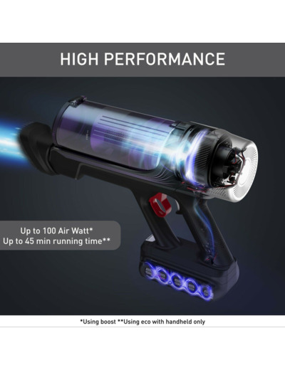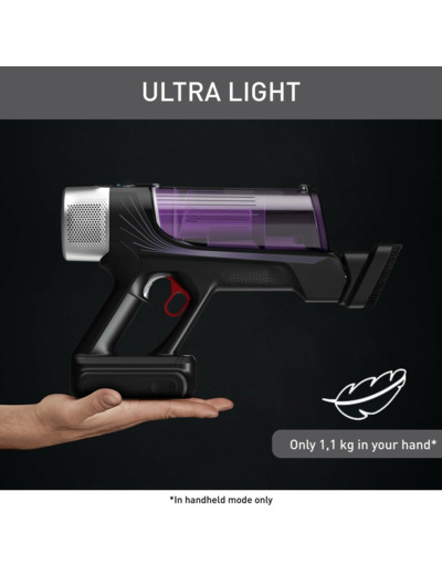 Johdoton pölynimuri on helppo ottaa esille ja laittaa takaisin, eikä se vie juuri rikkaharjaa enempää tilaa. Rikkaimuri painaa vain 1,1 kg ja se on helppo irrottaa varresta murusien tai pölyn nopeaa imurointia varten eri pinnoilta, mikä on entistä helpompaa integroidun harjasuulakkeen ansiosta. Imurissa on myös Boost-tehopainike, joka antaa 100 ilmawatin lisätehon juuri silloin, kun sitä tarvitaan.
