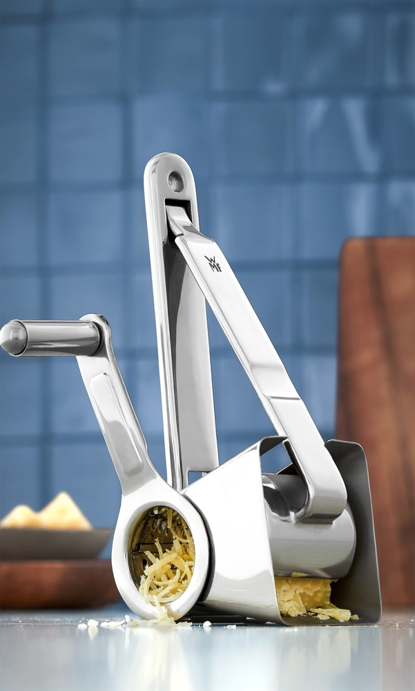 Italialainen parmesaanijuusto on yksi suosituimpia juustoja mitä ruoanlaittoon tulee. Parmesaani on erittäin kova juusto, se on maultaan voimakas ja antaa moniin ruokiin lisää makua. Esimerkiksi pastaa syötäessä on kätevää, että juustoa voi raastaa suoraan ruoan päälle - WMF:n juustoraastinmylly on siihen mainio apu. WMF:n juustoraastinmyllyllä raastat kätevästi parmesaanin ja muut kovat juustot, mutta voit käyttää sitä myös suklaan tai pähkinän rouhimiseen. Viimeistele siis ateria tai koristele jälkiruoka kätevästi raastinmyllyä käyttäen! WMF-juustoraastinmylly on valmistettu ruostumattomasta Cromargan® 18/10 -teräksestä. Tuote kestää konepesun. Mitat: 7,6 cm (korkeus), 5,5 cm (leveys), 18 cm (pituus). Kun tuotteen valmistusmateriaalin pitää olla korkealaatuista, kestävää ja kiiltonsa vuodesta toiseen säilyttävää, on luonnollinen valinta WMF:n ruostumaton Cromargan® 18/10 -teräs. Cromargan® on rekisteröity tavaramerkki, joka varmistaa sen, että WMF:n Cromargan®-teräs eroaa muusta ruostumattomasta teräksestä. Sen valmistusprosessit ovat tehokkaat ja korkealaatuiset. Cromargan®-teräksen laatua valvotaan tarkasti ja säännöllisesti, jolloin siitä valmistetut tuotteet täyttävät jatkuvasti niille asetetut vaatimukset. Lisäksi Cromargan®-teräs on erittäin kestävää naarmuuntumista ja kulumista vastaan sekä täysin ruosteenkestävää. Se ei kerää lainkaan makuja ja kestää myös ruoan happoja. Cromargan®-teräs valmistetaan Saksassa. WMF on yksi maailman johtavista ruostumattomien terästuotteiden valmistajista ja se on tuottanut vuodesta 1853 lähtien korkealaatuisia ja käteviä keittiö- ja kodintarviketuotteita. WMF on voittanut monia kansainvälisiä muotoilupalkintoja sekä tuotesuunnittelusta että toimivuudesta, erityisesti paistinpannuihin, kattiloihin ja Cromargan®-teräksen valmistukseen liittyen. Valikoimaan kuuluu keitto- ja paistoastioiden, veitsien ja aterimien lisäksi myös erilaisia sähköisiä kodinkoneita.
