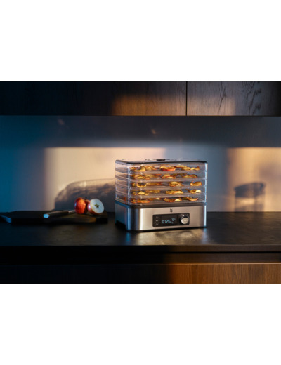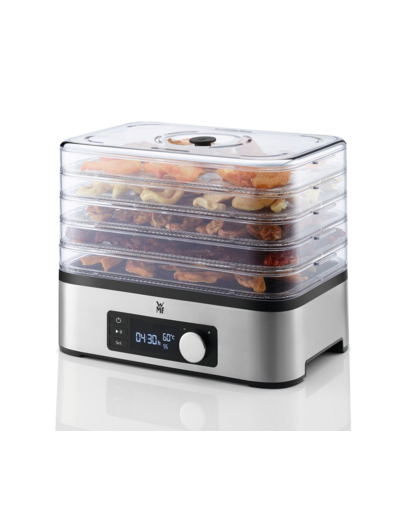 Valitse WMF KITCHENminis®, kun haluat säästää tilaa keittiöpöydällä ja kaapissa! Voit ostaa kuivattuja hedelmiä, kuivattuja sieniä, yrttejä, kasvislastuja, kuivalihaa ja myslipatukoita kaupasta tai voit tehdä ne edullisesti itse. Kuivasäilönnässä ei käytetä mitään lisäaineita, minkä ansiosta maku on luonnollinen ja täyteläinen ainekset maistuvat tuoreelta vuosienkin säilytyksen jälkeen. Lisäksi ainesten kaikki vitamiinit säilyvät tehokkaasti. Erittäin kompakti ja energiaa säästävä WMF KITCHENminis® Snack to Go -kasvikuivain kuivaa kaiken, mikä laitetaan kuivausritilöille tai erityiseen silikonimuottiin halutessasi myös yön aikana. Seuraavana aamuna voit ottaa helposti pienet maukkaat herkut mukaasi töihin tai antaa ne lapsillesi välipalaksi. Herkulliset välipalat ja myslipatukat valmistuvat hiljaisesti viidellä ritilällä. Hyvä kuivaustulos perustuu laitteen tasaiseen kuivauslämpötilaan 30-70 astetta ja hyvään ilmankiertoon. Ylikuumenemissuoja ja automaattinen virrankatkaisu varmistavat laitteen turvallisen käytön. Pakkaukseen sisältyy: 5 kuivausritilää, silikoninen myslipatukkamuotti sekä käytännöllinen mukaan otettava setti, jossa on kaksi säilytysrasiaa ja myslipatukkarasia. Kuivain on luonnollisesti valmistettu korkealaatuisesta, ruostumattomasta Cromargan®-teräksestä. Ajastin 0-24 tuntia. LCD-näytössä näkyy kuivauslämpötila ja jäljellä oleva toiminta-aika. Teho 220 W. WMF KITCHENminis® -kasvikuivaimen leveys on 27,7 cm, syvyys 18,8 cm ja korkeus 20,4 cm. Liitosjohdon pituus on 1 m. Miksi valita WMF KITCHENminis® WMF:n jatkuva tuotekehitys on ottanut huomioon asumisen ja elämisen trendit. Ihmiset ovat siirtyneet kaupunkeihin, joissa keittiöt ovat yleensä pienet ja niiden säilytys- ja pöytätilat rajalliset. Myös yhden ja kahden hengen kotitalouksien määrä on kasvanut. WMF suunnitteli Kitchen Minis -sarjan erityisesti tähän tarpeeseen. WMF KITCHENminis® -sarjan kodinkoneet ovat pienikokoisia ja vain vähän tilaa vieviä. Vaikka sarjan tuotteet säästävät tilaa, resursseja ja energiaa, ne pärjäävät suorituskyvyltään yhtä hyvin kuin vastaavat isompikokoiset laitteet. Lisäksi niissä näkyy korkea laatu ja WMF:lle tyypillinen muotoilu. Kun tuotteen valmistusmateriaalin pitää olla korkealaatuista, kestävää ja kiiltonsa vuodesta toiseen säilyttävää, on luonnollinen valinta WMF:n ruostumaton Cromargan® 18/10 -teräs. Cromargan® on rekisteröity tavaramerkki, joka varmistaa sen, että WMF:n Cromargan®-teräs eroaa muusta ruostumattomasta teräksestä. Sen valmistusprosessit ovat tehokkaat ja korkealaatuiset. Cromargan®-teräksen laatua valvotaan tarkasti ja säännöllisesti, jolloin siitä valmistetut tuotteet täyttävät jatkuvasti niille asetetut vaatimukset. Lisäksi Cromargan®-teräs on erittäin kestävää naarmuuntumista ja kulumista vastaan sekä täysin ruosteenkestävää. Se ei kerää lainkaan makuja ja kestää myös ruoan happoja. Cromargan®-teräs valmistetaan Saksassa. WMF on yksi maailman johtavista ruostumattomien terästuotteiden valmistajista ja se on tuottanut vuodesta 1853 lähtien korkealaatuisia ja käteviä keittiö- ja kodintarviketuotteita. WMF on voittanut monia kansainvälisiä muotoilupalkintoja sekä tuotesuunnittelusta että toimivuudesta, erityisesti paistinpannuihin, kattiloihin ja Cromargan®-teräksen valmistukseen liittyen. Valikoimaan kuuluu keitto- ja paistoastioiden, veitsien ja aterimien lisäksi myös erilaisia sähköisiä kodinkoneita. 5 tasoa kuivatukseen LCD-näyttö, lämpötilan valinta 30°C70°C