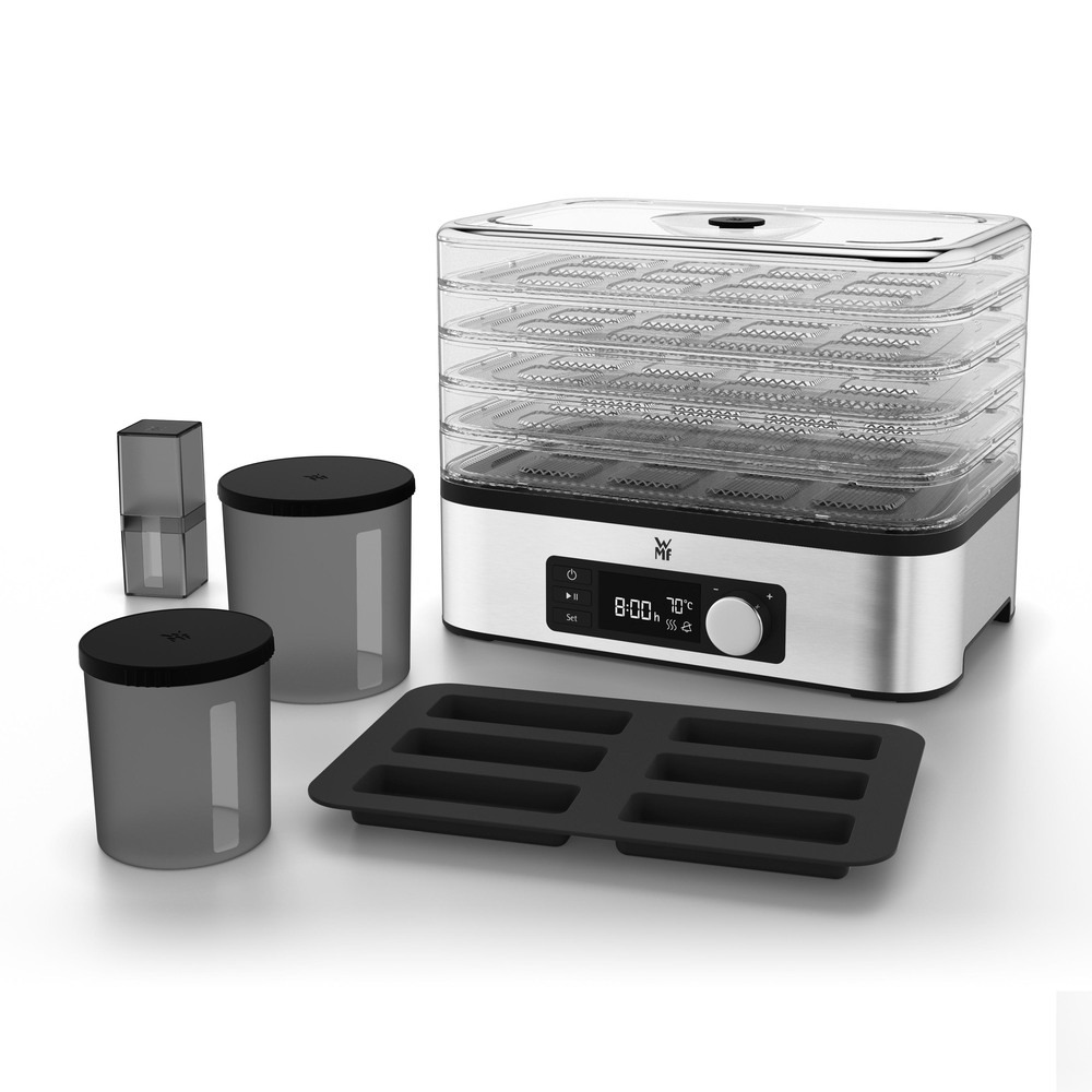 Valitse WMF KITCHENminis®, kun haluat säästää tilaa keittiöpöydällä ja kaapissa! Voit ostaa kuivattuja hedelmiä, kuivattuja sieniä, yrttejä, kasvislastuja, kuivalihaa ja myslipatukoita kaupasta tai voit tehdä ne edullisesti itse. Kuivasäilönnässä ei käytetä mitään lisäaineita, minkä ansiosta maku on luonnollinen ja täyteläinen ainekset maistuvat tuoreelta vuosienkin säilytyksen jälkeen. Lisäksi ainesten kaikki vitamiinit säilyvät tehokkaasti. Erittäin kompakti ja energiaa säästävä WMF KITCHENminis® Snack to Go -kasvikuivain kuivaa kaiken, mikä laitetaan kuivausritilöille tai erityiseen silikonimuottiin halutessasi myös yön aikana. Seuraavana aamuna voit ottaa helposti pienet maukkaat herkut mukaasi töihin tai antaa ne lapsillesi välipalaksi. Herkulliset välipalat ja myslipatukat valmistuvat hiljaisesti viidellä ritilällä. Hyvä kuivaustulos perustuu laitteen tasaiseen kuivauslämpötilaan 30-70 astetta ja hyvään ilmankiertoon. Ylikuumenemissuoja ja automaattinen virrankatkaisu varmistavat laitteen turvallisen käytön. Pakkaukseen sisältyy: 5 kuivausritilää, silikoninen myslipatukkamuotti sekä käytännöllinen mukaan otettava setti, jossa on kaksi säilytysrasiaa ja myslipatukkarasia. Kuivain on luonnollisesti valmistettu korkealaatuisesta, ruostumattomasta Cromargan®-teräksestä. Ajastin 0-24 tuntia. LCD-näytössä näkyy kuivauslämpötila ja jäljellä oleva toiminta-aika. Teho 220 W. WMF KITCHENminis® -kasvikuivaimen leveys on 27,7 cm, syvyys 18,8 cm ja korkeus 20,4 cm. Liitosjohdon pituus on 1 m. Miksi valita WMF KITCHENminis® WMF:n jatkuva tuotekehitys on ottanut huomioon asumisen ja elämisen trendit. Ihmiset ovat siirtyneet kaupunkeihin, joissa keittiöt ovat yleensä pienet ja niiden säilytys- ja pöytätilat rajalliset. Myös yhden ja kahden hengen kotitalouksien määrä on kasvanut. WMF suunnitteli Kitchen Minis -sarjan erityisesti tähän tarpeeseen. WMF KITCHENminis® -sarjan kodinkoneet ovat pienikokoisia ja vain vähän tilaa vieviä. Vaikka sarjan tuotteet säästävät tilaa, resursseja ja energiaa, ne pärjäävät suorituskyvyltään yhtä hyvin kuin vastaavat isompikokoiset laitteet. Lisäksi niissä näkyy korkea laatu ja WMF:lle tyypillinen muotoilu. Kun tuotteen valmistusmateriaalin pitää olla korkealaatuista, kestävää ja kiiltonsa vuodesta toiseen säilyttävää, on luonnollinen valinta WMF:n ruostumaton Cromargan® 18/10 -teräs. Cromargan® on rekisteröity tavaramerkki, joka varmistaa sen, että WMF:n Cromargan®-teräs eroaa muusta ruostumattomasta teräksestä. Sen valmistusprosessit ovat tehokkaat ja korkealaatuiset. Cromargan®-teräksen laatua valvotaan tarkasti ja säännöllisesti, jolloin siitä valmistetut tuotteet täyttävät jatkuvasti niille asetetut vaatimukset. Lisäksi Cromargan®-teräs on erittäin kestävää naarmuuntumista ja kulumista vastaan sekä täysin ruosteenkestävää. Se ei kerää lainkaan makuja ja kestää myös ruoan happoja. Cromargan®-teräs valmistetaan Saksassa. WMF on yksi maailman johtavista ruostumattomien terästuotteiden valmistajista ja se on tuottanut vuodesta 1853 lähtien korkealaatuisia ja käteviä keittiö- ja kodintarviketuotteita. WMF on voittanut monia kansainvälisiä muotoilupalkintoja sekä tuotesuunnittelusta että toimivuudesta, erityisesti paistinpannuihin, kattiloihin ja Cromargan®-teräksen valmistukseen liittyen. Valikoimaan kuuluu keitto- ja paistoastioiden, veitsien ja aterimien lisäksi myös erilaisia sähköisiä kodinkoneita. Hedelmä-, vihannes- ja sienikuivain Cromargan® matta Elektroninen ilmankierto tasaisen lopputuloksen saavuttamiseksi
