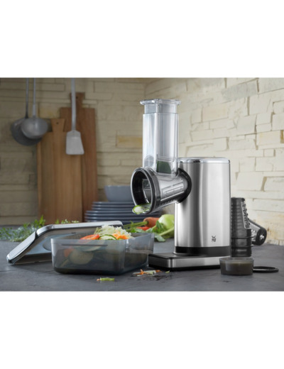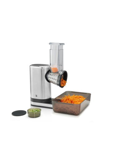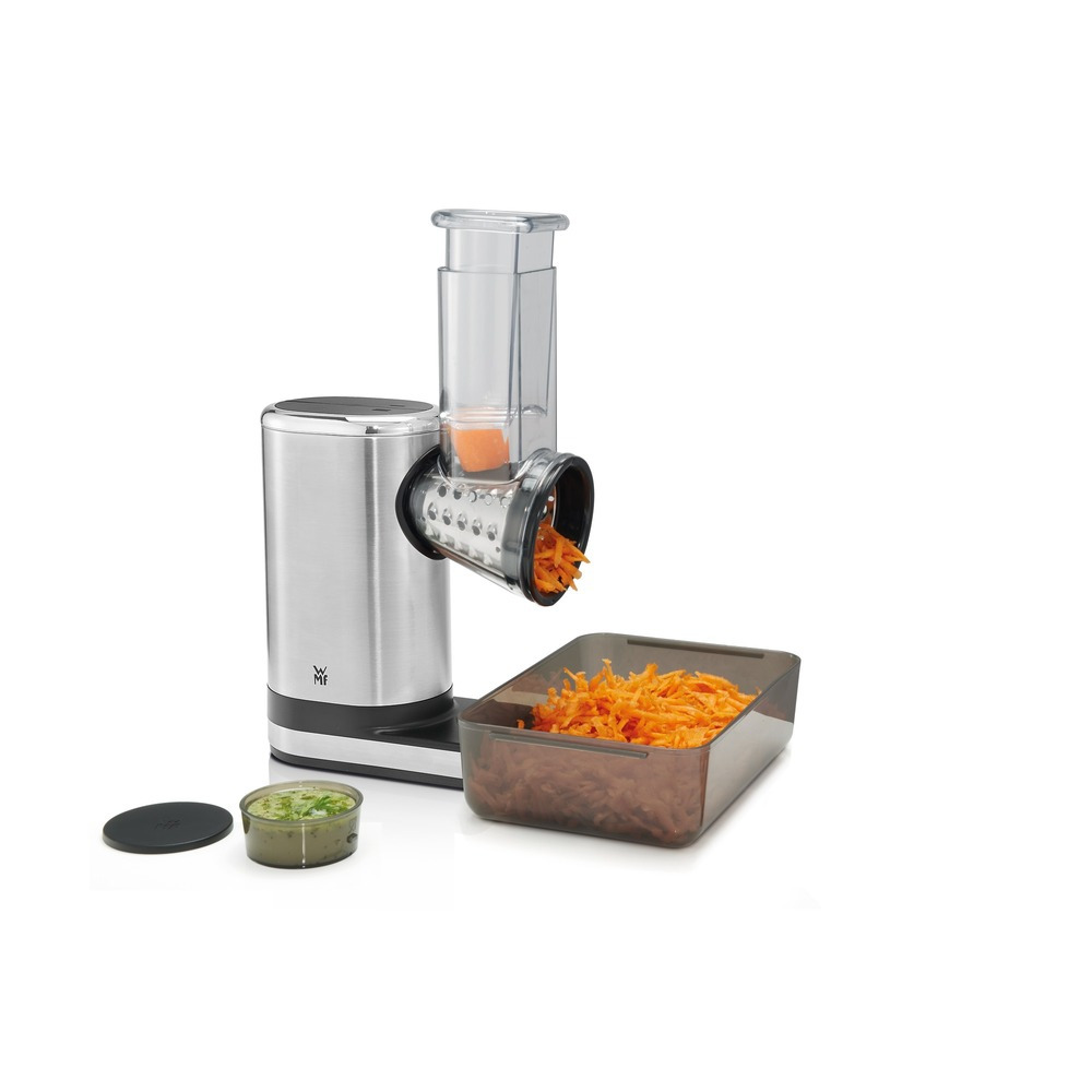 Jos haluat nauttia terveellisen ja raikkaan salaatin tien päällä, Salat-to-go on juuri oikea valinta. Tämä pieni keittiöväline pilkkoo kaikki mahdolliset hedelmät ja vihannekset porkkanoista kaaliin ja hienontaa myös kovat ainesosat, kuten pähkinät sekä raastaa juuston valon nopeudella käytännöllisessä to-go-kulhossa. Integroidulle kastikeastialle on oma paikkansa kannessa. Näin salaatti säilyy raikkaana ja rapeana ja voidaan nauttia itsetehdyn kastikkeen kanssa. Lisätarvikkeena on saatavana viisi vaihdettavaa Cromargan®-lisäosaa ja siten asiantuntija joka tarkoitukseen. WMF Perfect Cut, jonka teho on 150 wattia. 5 Cromargan®-osaa eri tarkoituksiin ja eri vihanneksille.