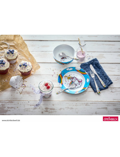 WMF:n lasten ruokailuvälineiden avulla syömisen opettelu on hauskaa. Lasten rakastama taruolento Yksisarvinen lentää apuun ja silloin kaikki maistuu paljon paremmalta. WMF:llä on yli 130 vuoden kokemus lasten ruokailuvälineiden valmistuksesta. Veitset, haarukat ja lusikat ovat täydellisen tasapainotettuja. Aterimien koko ja tukevat varret sopivat täydellisesti pienille käsille ja lasten hienomotorisille taidoille. Lusikan pesässä on pyöristetyt reunat ja haarukan piikit ovat lyhyet ja tylpät, joten ne sopivat hyvin pieniin suihin. Aterimet houkuttelevat hyvän ergonomisen muotoilunsa ja hauskojen kuvien ansiosta lapsia syömään itsenäisesti ja näin pieni lapsi kokee voivansa tehdä samoja asioita kuin isommatkin lapset. Aterimet soveltuvat yli 3-vuotiaille. Setin kaikki osat ovat elintarvikekäyttöön tarkoitettuja ja konepesun kestäviä. WMF Yksisarvinen -setin 6 osaa ovat lahjapakkauksessa ja tuotteet ovat tietenkin parasta WMF-laatua: Kulho ja lautanen ovat hienointa posliinia ja aterimet ovat ruostumatonta, kiillotettua Cromargan® 18/10 -terästä. Täydellinen lahja esimerkiksi kaste- ja syntymäpäiväjuhliin. Kaikki WMF:n lastenaterimet voidaan kaivertaa. Pakkaus sisältää: 1 x lasten ruokaveitsi (pituus n. 18,5 cm), 1 x lasten ruokahaarukka (pituus n. 16,5 cm), 1 x lasten ruokalusikka (pituus n. 16,5 cm), 1 x lasten pikkulusikka (pituus n. 13,2 cm), 1 x posliinikulho (Ø 14 cm), 1 x posliinilautanen (Ø 19 cm). Kun tuotteen valmistusmateriaalin pitää olla korkealaatuista, kestävää ja kiiltonsa vuodesta toiseen säilyttävää, on luonnollinen valinta WMF:n ruostumaton Cromargan® 18/10 -teräs. Cromargan® on rekisteröity tavaramerkki, joka varmistaa sen, että WMF:n Cromargan®-teräs eroaa muusta ruostumattomasta teräksestä. Sen valmistusprosessit ovat tehokkaat ja korkealaatuiset. Cromargan®-teräksen laatua valvotaan tarkasti ja säännöllisesti, jolloin siitä valmistetut tuotteet täyttävät jatkuvasti niille asetetut vaatimukset. Lisäksi Cromargan®-teräs on erittäin kestävää naarmuuntumista ja kulumista vastaan sekä täysin ruosteenkestävää. Se ei kerää lainkaan makuja ja kestää myös ruoan happoja. Cromargan®-teräs valmistetaan Saksassa. WMF on yksi maailman johtavista ruostumattomien terästuotteiden valmistajista ja se on tuottanut vuodesta 1853 lähtien korkealaatuisia ja käteviä keittiö- ja kodintarviketuotteita. WMF on voittanut monia kansainvälisiä muotoilupalkintoja sekä tuotesuunnittelusta että toimivuudesta, erityisesti paistinpannuihin, kattiloihin ja Cromargan®-teräksen valmistukseen liittyen. Valikoimaan kuuluu keitto- ja paistoastioiden, veitsien ja aterimien lisäksi myös erilaisia sähköisiä kodinkoneita.