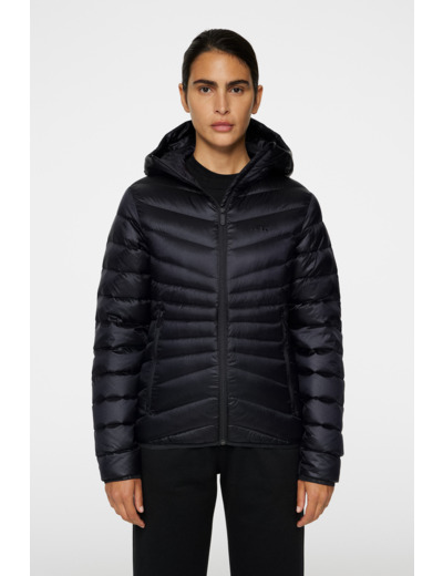 Elevate your style with the Lara Light Down Hood, a hooded version of our lightweight down jacket. Crafted in VX AIRIDESCENT, it features a new seasonal quilt and a princess cut that flatters the figure. Regular fit 2-way zip at center front Zip-pockets Elastic bindings on sleeve and bottom hem Hood with cord adjustment JL Bridge logo on the chest Water-repellent Windproof Ultra light Glansfuld 44 g/m2