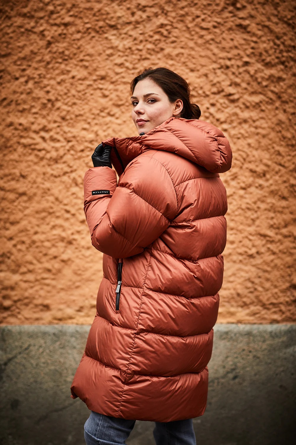 Silvia on erittäin kevyt, kestävä ja lämmin untuvatakki, joka hylkii vettä ja pitää hyvin tuulta. Se on näyttävän muhkea ja tarjoaa sinulle monipuolista suojaa erilaisissa sääolosuhteissa. Takin voi pakata omaan vetoketjulliseen sisätaskuunsa ja kuljettaa helposti mukana myös hiihtolenkkien ja vaellusten tauoille lämmikkeeksi. Kiinteä huppu ja säädettävä helma varmistavat optimaalisen lämmön ja mukavuuden. Takin täyte on 100-prosenttista vastuullisesti tuotettua untuvaa. Silviasta saat luottotakin niin kaupungin vilskeeseen kuin retkille luonnonhelmaan.
