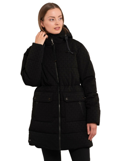 Peittävää lämpöä Luhdan keinountuvatakista, jonka vettähylkivä pinta on hillitysti kuvioitua. Tyylikkään toppatakin kiinteässä hupussa on kiristysnyörit, ja hihoissa on joustavat sisemmät hihansuut. Edessä kaksi tilavaa, läpällistä nepparitaskua sekä vuorilliset taskut käsien lämmittelyyn. Sisäpuolella yksi vetoketjutasku. Vetoketju edessä avautuu kahteen suuntaan, ja sen vetimessä on irrotettava koriste. Vyötäröllä on kiristysmahdollisuus. Takin toppaus on untuvajäljitelmää, mutta se tarjoaa hyvän lämmöneristyksen ja tuntuu kevyeltä. Vuori on polyesteriä. Hyvännäköinen talvitakki liikkumiseen ja kaikkeen arkimenoon.
