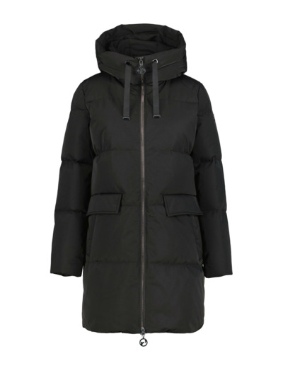 Muhkea city-tyylinen, puolipitkä untuvatakki, jossa kiinteä huppu ja korkea pystykaulus. Yksityiskohtana korostuu kiiltävä, kaksisuuntainen etuvetoketju koristeellisin metallisin logovetimin. Materiaali on laadukas, vettähylkivä ja hengittävä 100-prosenttinen polyesteri, jossa mattakiiltoinen pinta. Lämmin täyte sisältää 70 % untuvaa ja 30 % höyhentä. Takapituus on 86 cm koossa 36.