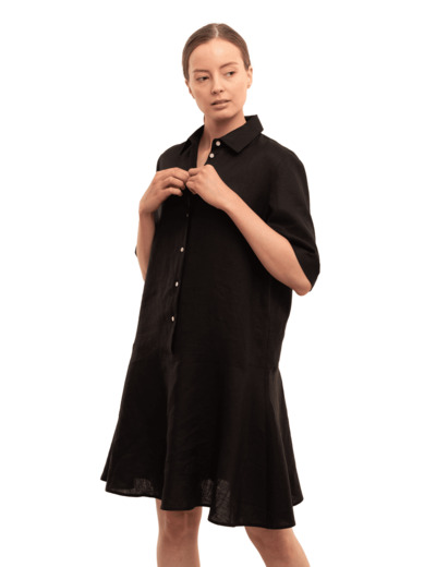 Pellavainen paitulimekko ryhdikkäällä paitakauluksella, huolitelluilla paksulankatikkauksilla ja helmiäsinapeilla. Vuorittomaan mekkoon luo kepeyttä madallettu poikkisauma viistotetulla, levenevällä helmalla, joka jää polven yläpuolelle. Takapituus on 96 cm koossa 36.
