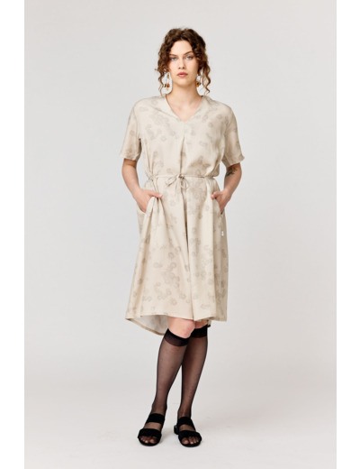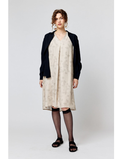 Polvipituinen mekko, jossa on V-pääntie edessä ja takana. Varustettu irrotettavalla vyöllä vyötäröllä. Viimeistelty apilakuviolla.