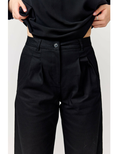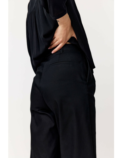 Leveälahkeiset housut, joissa on normaali istuvuus ja korkea vyötärö. Bella-housuissa on laskokset edessä ja joustava säätö vyötärön sisäpuolella.