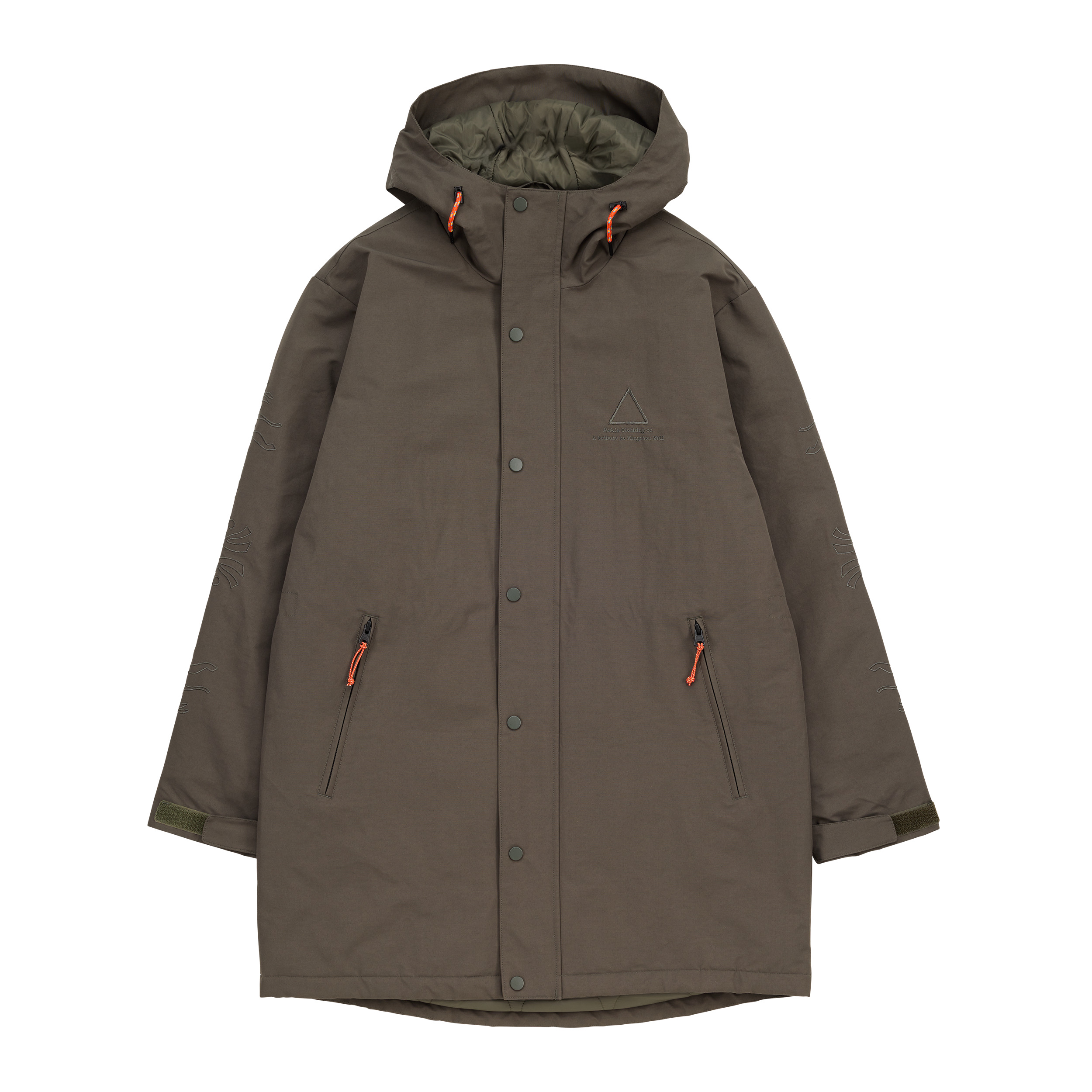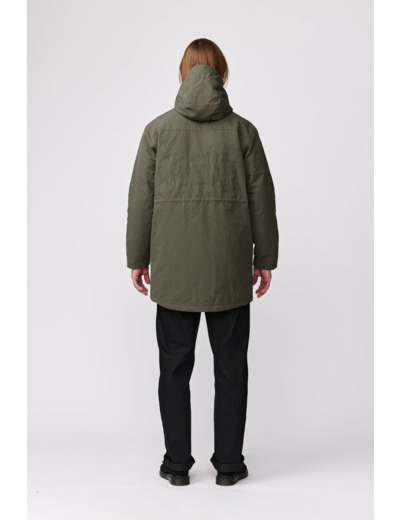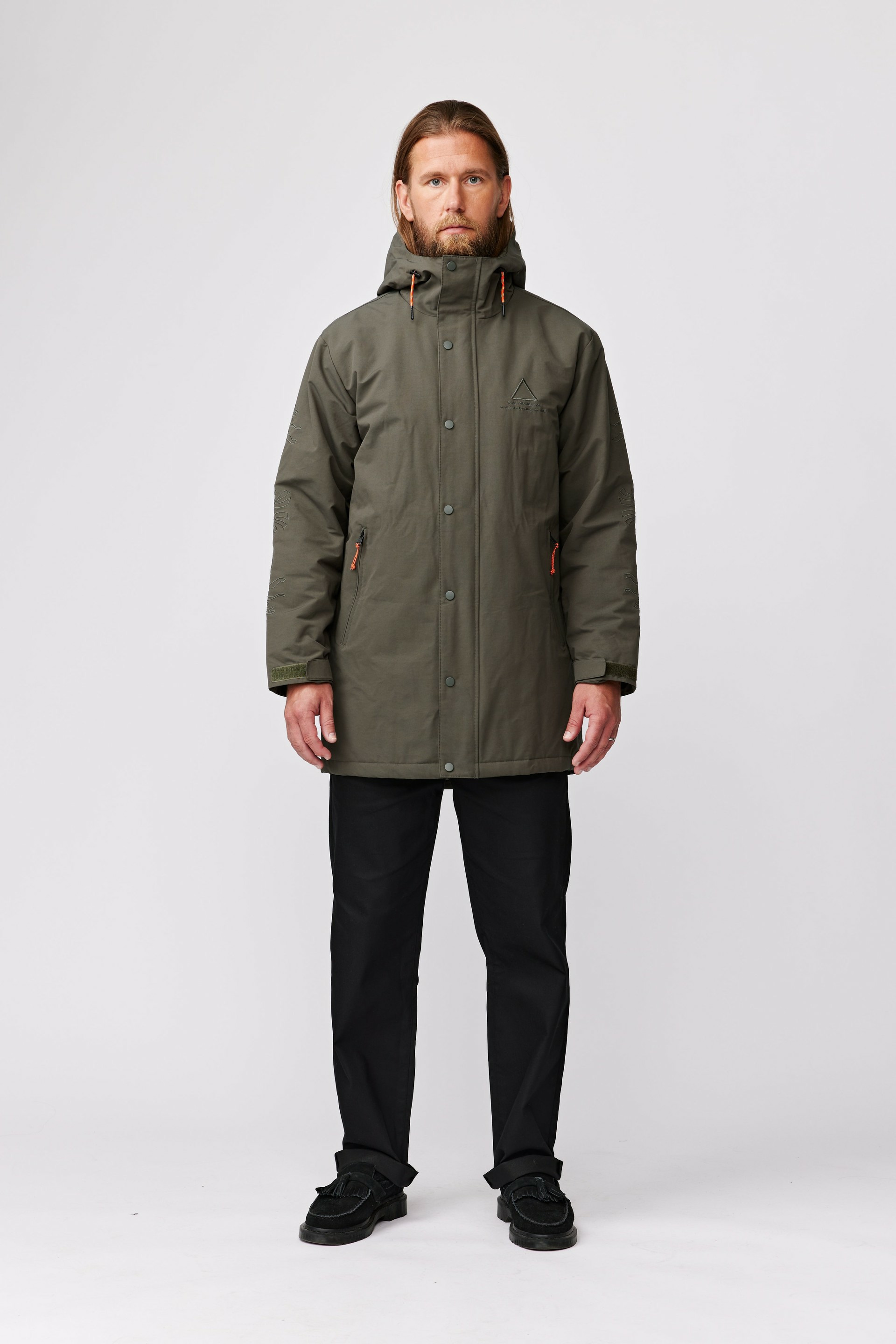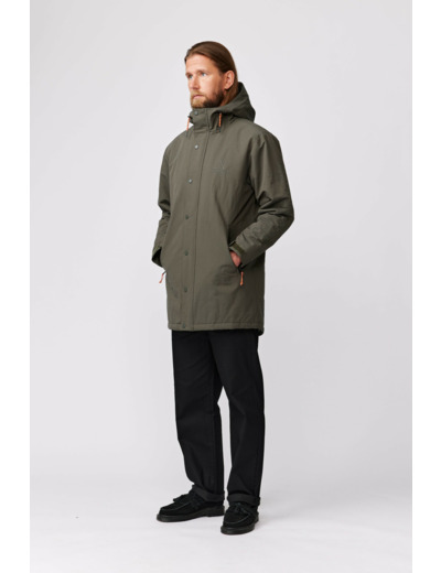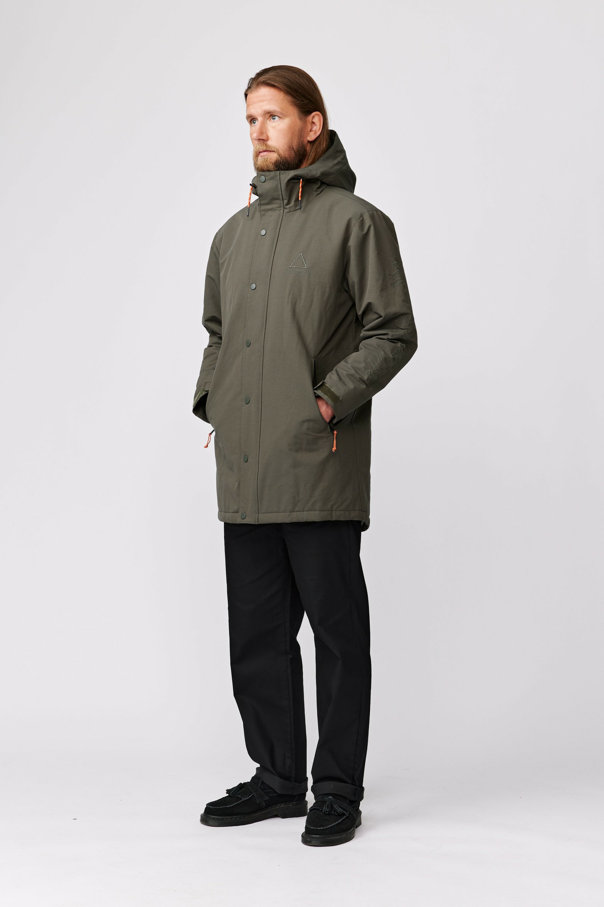 Normaali istuvuuden parka-takki talvikäyttöön. Kuori on valmistettu 73 % puuvillasta ja 27 % kierrätetystä nailonista. 5000 mm vedenpylväs auttaa pitämään satunnaisen sateen loitolla.