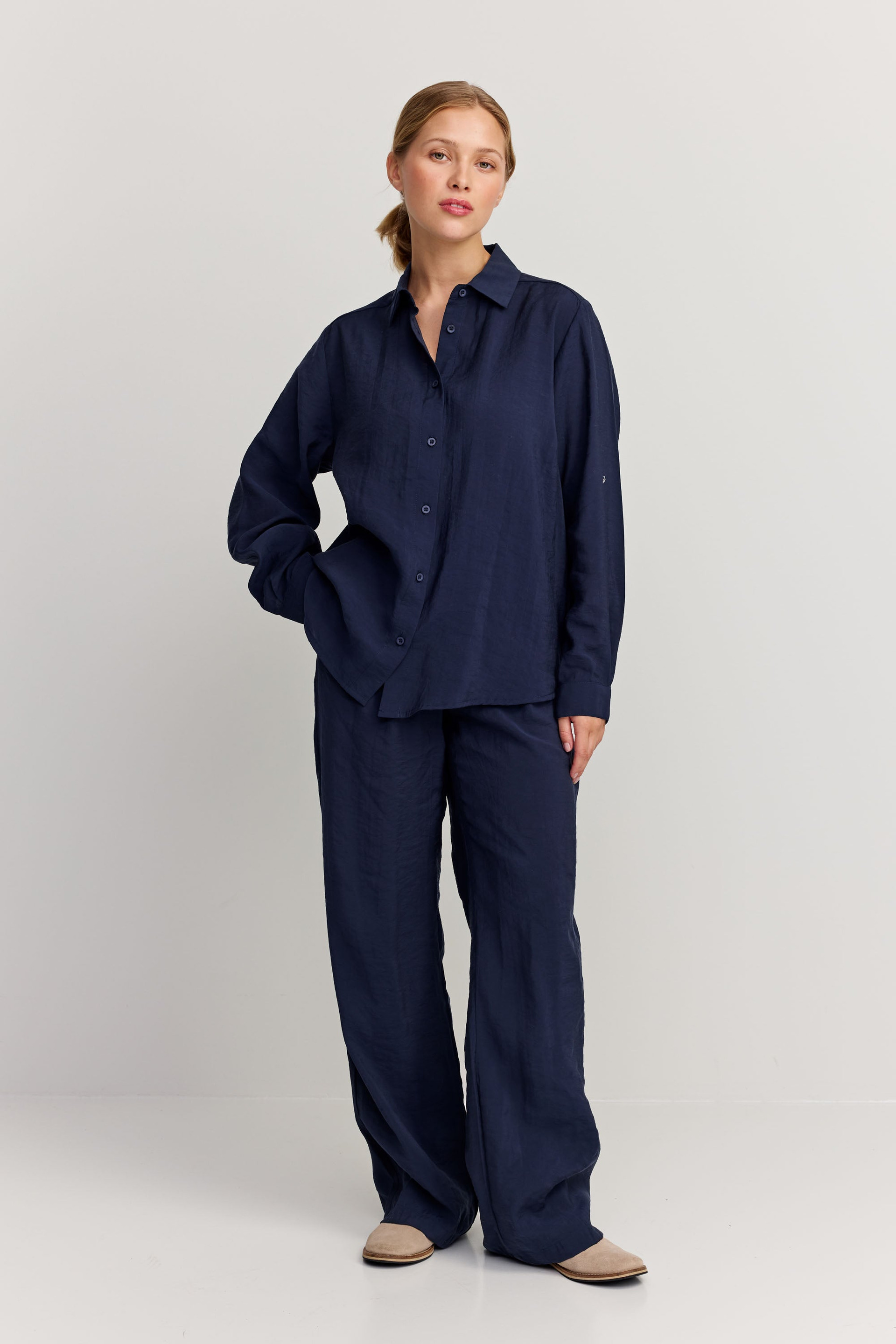 Klassinen napitettava paita, jossa on rento istuvuus. Hilda-paitassa on pyöristetty helma, joka on hieman pidempi takana, ja rintakehässä on muotoilut, jotka korostavat siluettia. Valmistettu modaalista ja polyesteristä.