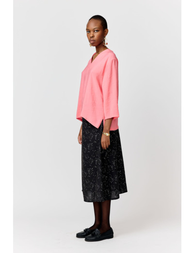 Hipulle ulottuva paita, jossa on normaali istuvuus. ¾ hihat ja V-pääntie.