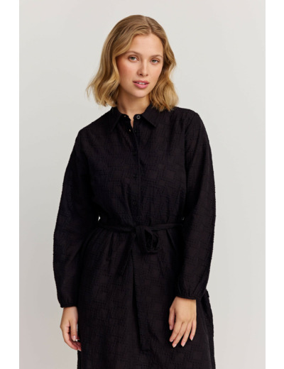 Polvipituinen mekko, jossa on normaali istuvuus ja nappikiinnitys. Lotte-mekossa on brodeerattu kuviokangas, sivutaskut ja vyö vyötäröllä.