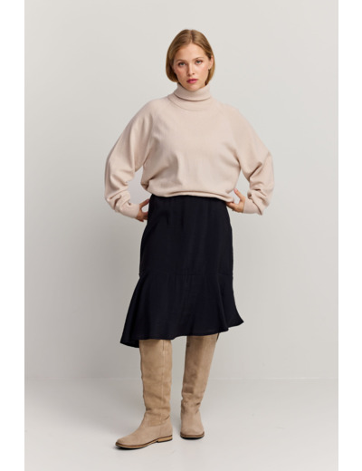Polvenpituinen poimutettu hame, jossa on röyhelö helman reunassa. Viimeistelty piilotetulla vetoketjulla ja koukulla sivusaumassa.