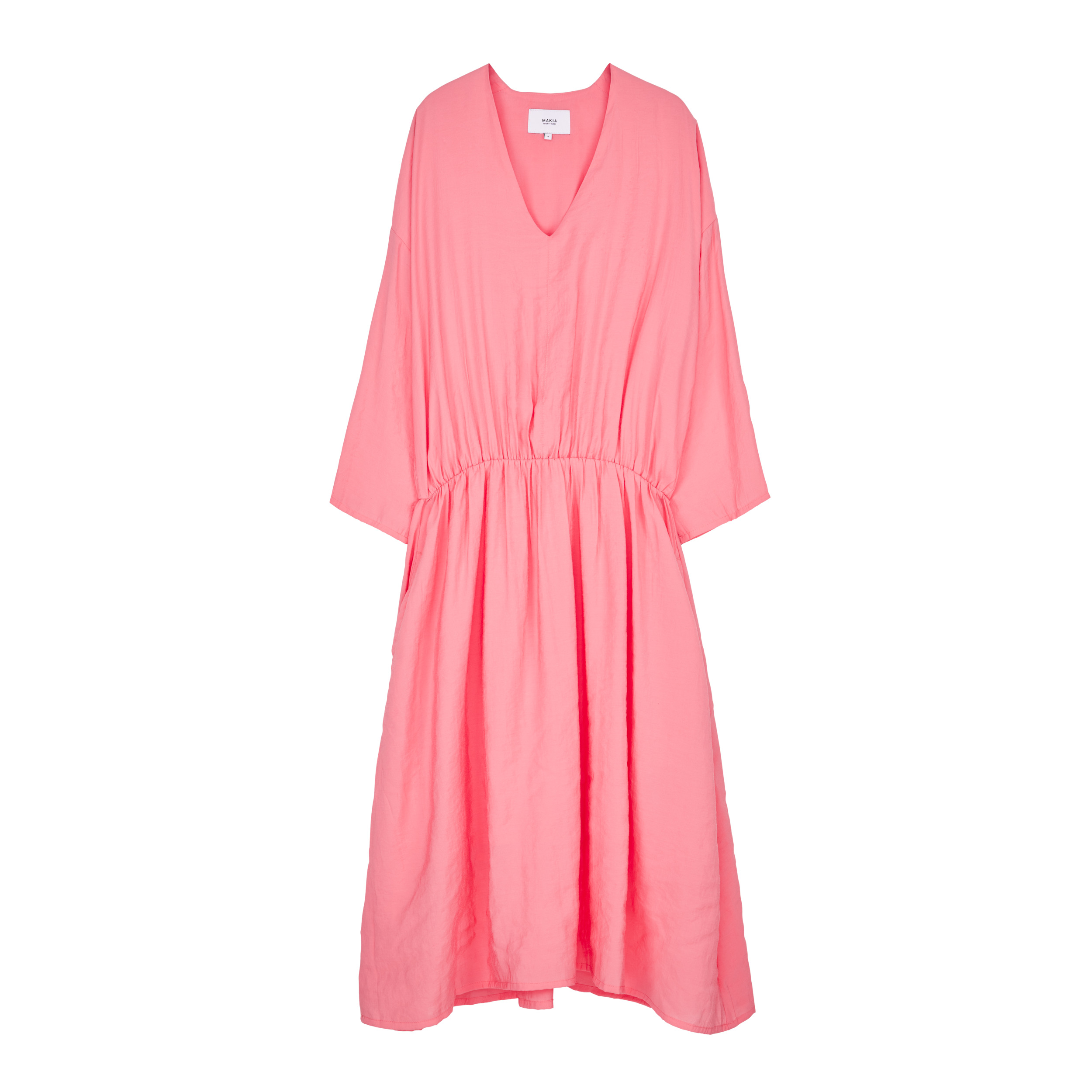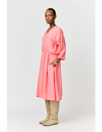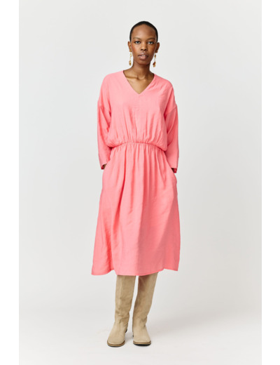 Keskipitkä mekko, jossa on normaali istuvuus ja ¾-hihat. V-aukkoinen kaula-aukko ja joustava vyötärö.