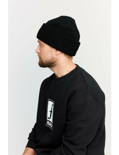 Beanie, joka on valmistettu 100 % merinovillasta, nahkapaikalla edessä. Valmistettu Suomessa.