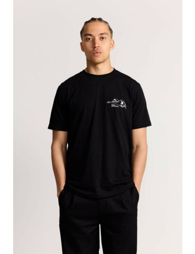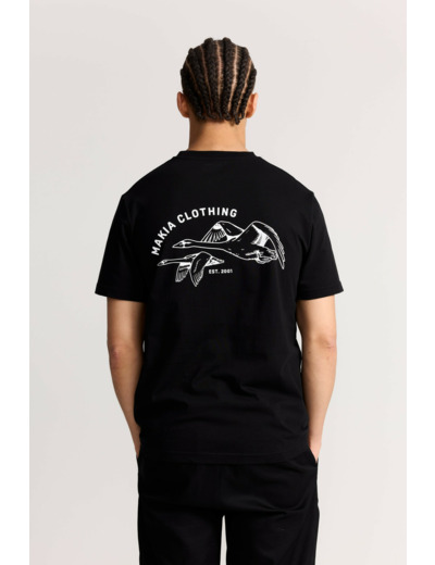 Rennosti istuva t-paita, jossa on suuri joutseniprintti selässä ja pienempi rintapainatus.