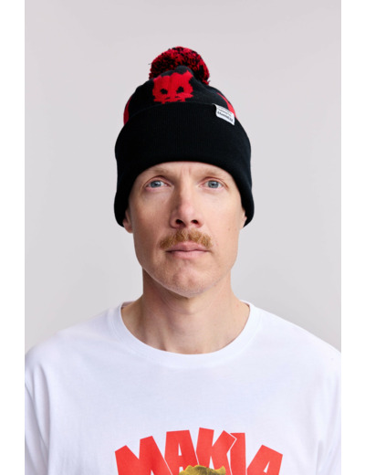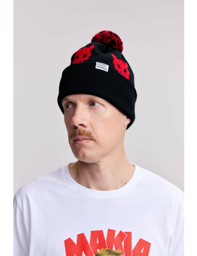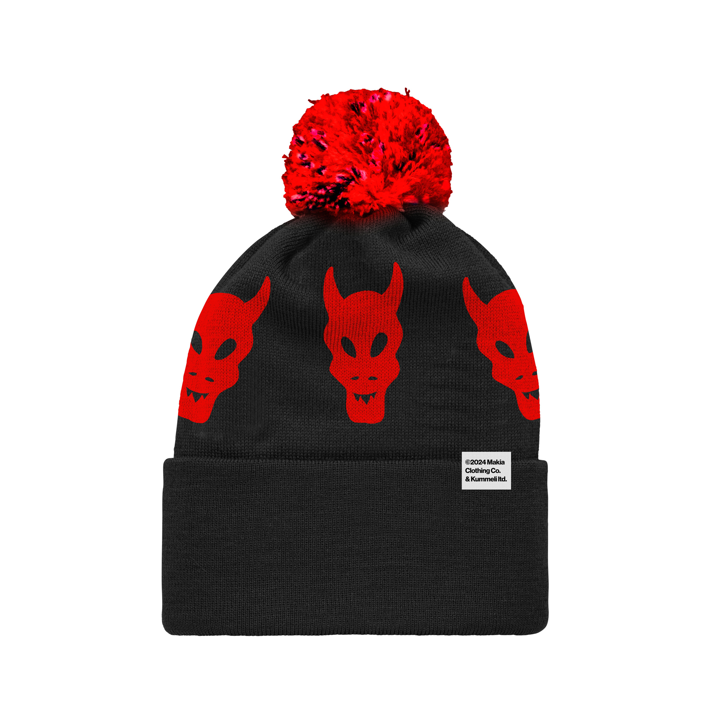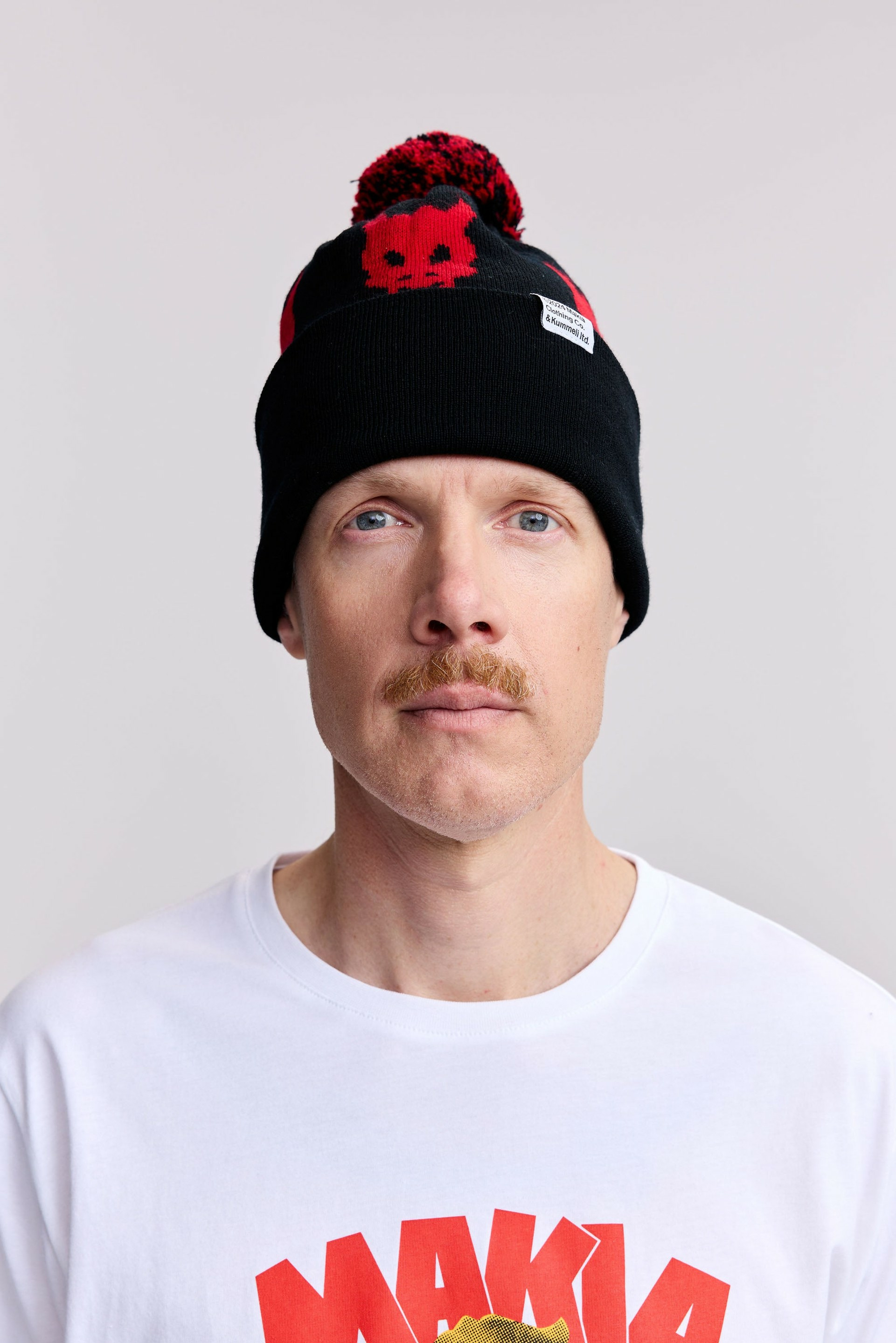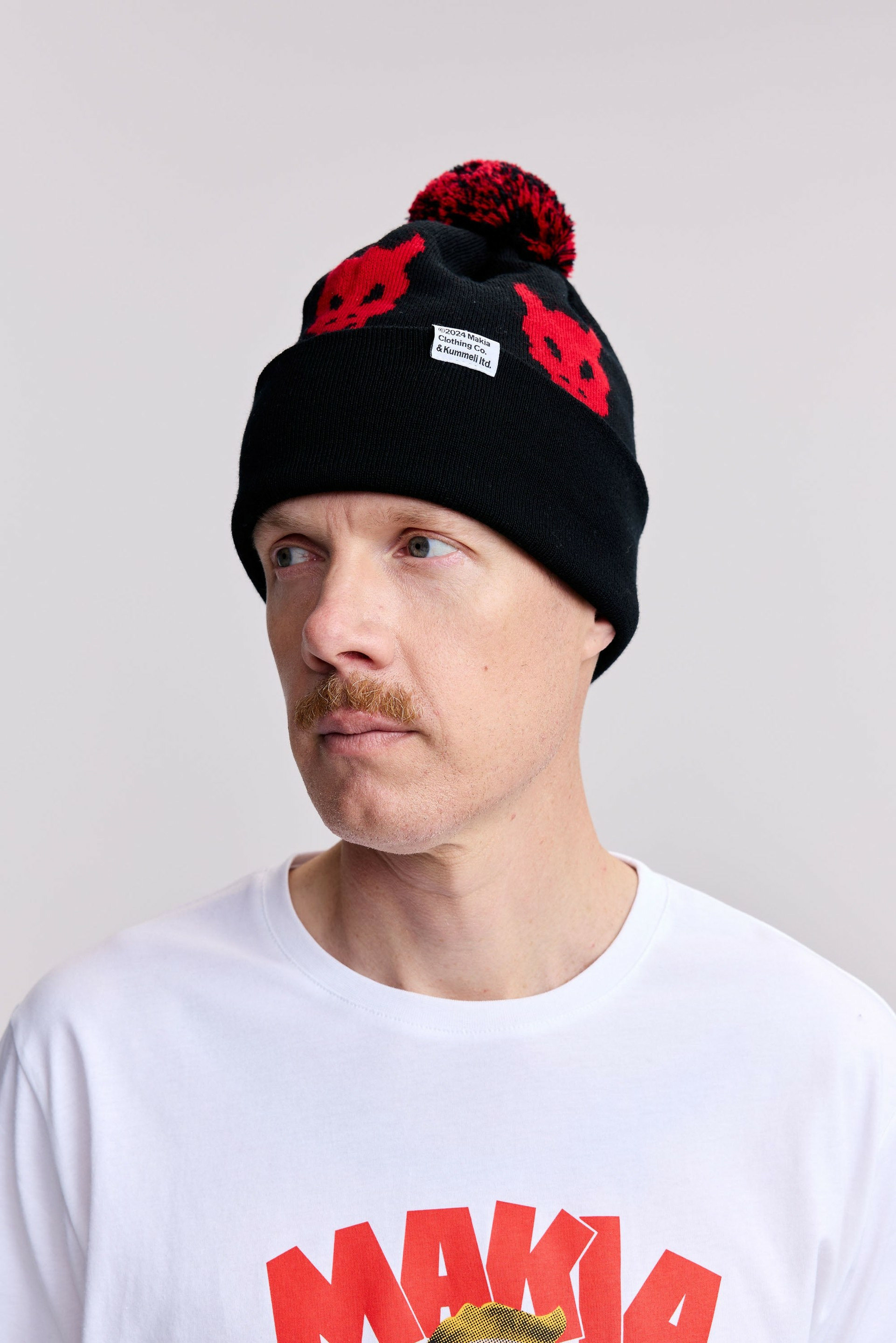 Tuomiopäivä on tulossa. Tuomiopäivä Beanie on valmistettu 100 % merinovillasta, jotta pääsi pysyy lämpimänä ja mukavana. Viimeistelty neulotuin paholaisilla ja pom-pomilla. Valmistettu Suomessa.
