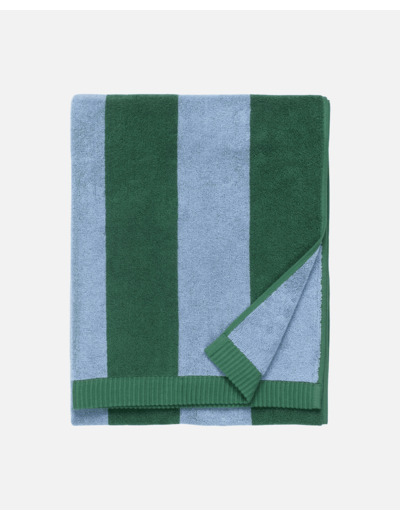 Pehmeästä puuvillafroteesta valmistetussa kylpypyyhkeessä on Juhlaraita-kuosi. Kuosin värit ovat päinvastaiset pyyhkeen toisella puolella.