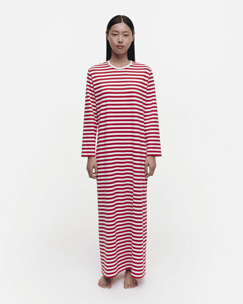 Tässä mukavassa, täyspitkässä puuvillaisessa yömekossa tahtoo oleskella unien jälkeenkin. Mekossa on klassinen Tasaraita-kuosi, pyöreä resorikantilla huoliteltu pääntie, pitkät hihat ja hieman levenevä leikkaus nilkan yläpuolelle päättyvään helmaan. Saatavilla vain kokoja XS ja S.