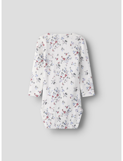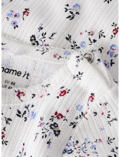 Ribbineulos joustaa miellyttävästi ja sen pystysuora raidallinen kuvio antaa ajattoman ilmeen. Kokopinta on koristeltu toistuvalla printillä, joka tekee bodysuitista ainutlaatuisen ja raikkaan. Käytännölliset painonapit haaroissa ja olkapäällä helpottavat pukemista ja vaipanvaihtoa.