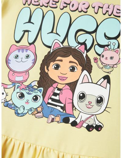 Kevyt ja joustava jersey-kangas tuntuu miellyttävältä ihoa vasten ja antaa vapauden liikkua. Mekon pyöreä pääntie ja lyhyet hihat tarjoavat rennon istuvuuden, kun taas kimaltava glitterprintti ja pehmeä kumipainatus tuovat ripauksen taikaa ja hauskuutta. Inspiraationa toimii suosittu Gabby’s Dollhouse -sarja, joka vie pienet seikkailijat mielikuvitusmatkalle.