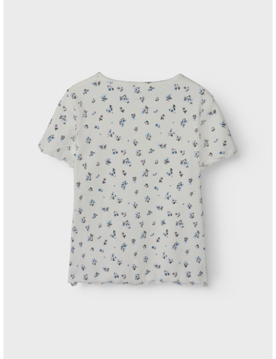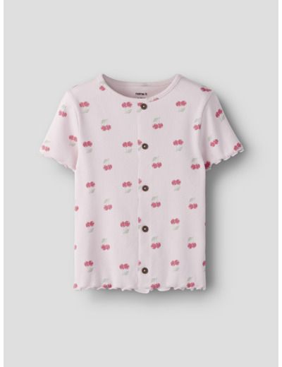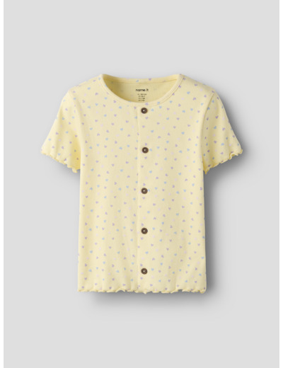 Tuotteen tekniset tiedot: T-paita, pyöreä pääntie, lyhyet hihat, röyhelöreunuksella varustetut hihansuut, napillinen yksityiskohta, slim fit -leikkaus, lyhyt pituus.