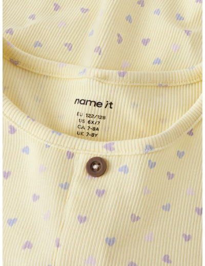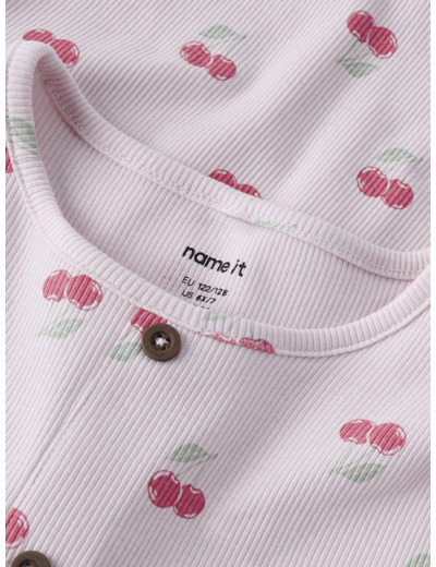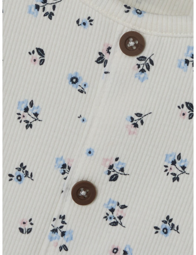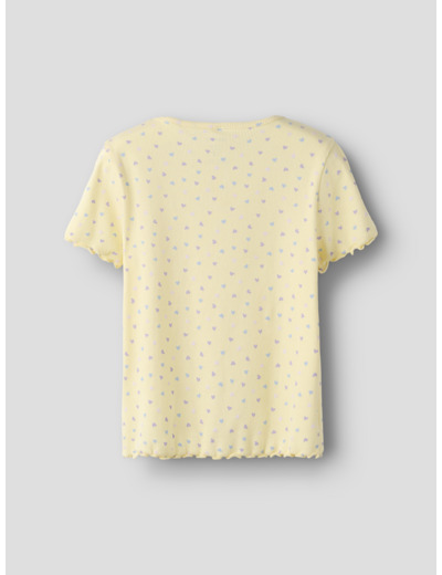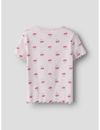 Tämä t-paita on valmistettu joustavasta ribbineuloksesta, jonka pystysuora raidoitus tuo ajattoman ilmeen. Pyöreä pääntie ja lyhyet hihat viimeistellään naisellisilla röyhelöreunuksilla, jotka lisäävät pieneen yksityiskohtaan hienostuneisuutta. Napillinen koriste tuo pieneen paitaan ripauksen persoonallisuutta ilman liiallista koristelua.